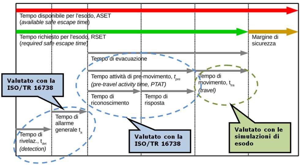 Con la Fire Engineering si può calcolare il tempo disponibile per l’esodo in sicurezza ASET da confrontare con il tempo necessario per l’esodo RSET nelle valutazioni della sicurezza della vita umana in caso di incendio.