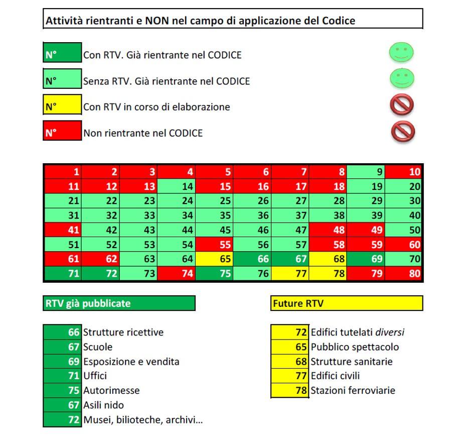 Per le altre destinazioni d’uso soggette, ricadenti nell’attività 72 ma diverse dai musei, biblioteche e simili, fino all’emanazione della futura RTV già in preparazione, si può fare riferimento alla Lettera Circolare DCPREV prot. n. 3181 del 15/3/2016, con allegate le: