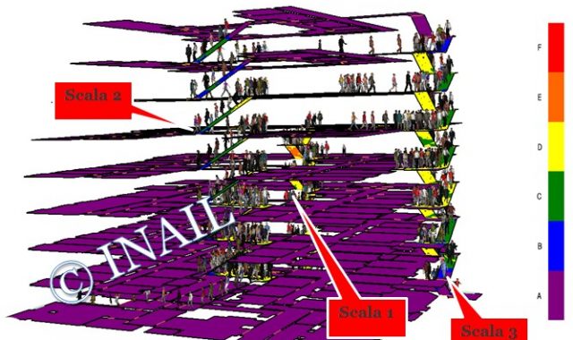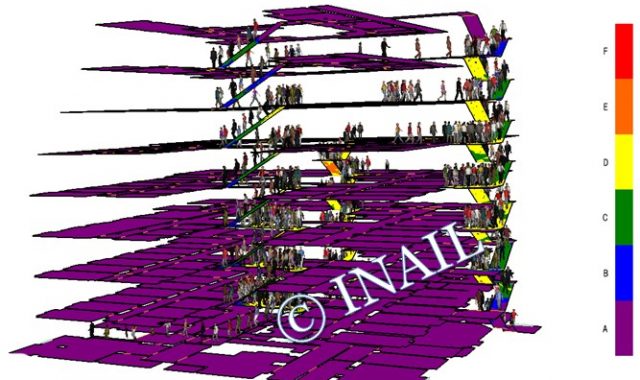 La pubblicazione INAIL contiene un approfondimento sul sistema di esodo di un fabbricato multipiano adibito a uffici. In questo studio è stato adoperato il software denominato Pathfinder, della Thunderhead Engineering, che è un simulatore del comportamento e del movimento di agenti umani. Con questo applicativo è possibile modellare un intero fabbricato, sulla base di un disegno al CAD, inserendo i parametri di affollamento e le vie di esodo derivanti dal progetto. E’ stato dapprima ricostruito il fabbricato oggetto della pubblicazione partendo dalle planimetrie di ciascun piano. Ad ogni locale è stato attribuito il valore di densità di affollamento in conformità con il Codice di prevenzione incendi, pertanto l’affollamento complessivo dell’edificio è pari a 700 persone. I vari livelli del fabbricato uffici sono stati messi in comunicazione mediante le 3 scale previste, come illustrato nell’immagine seguente.
