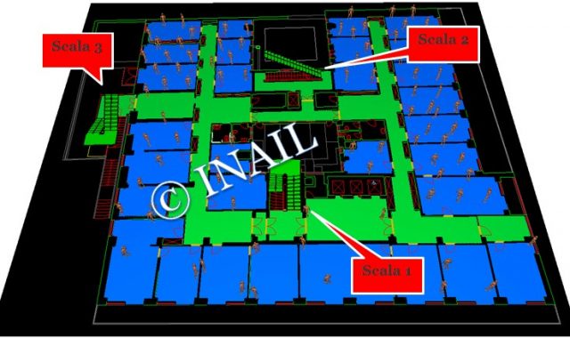 Nella pubblicazione INAIL sono rappresentati i risultati delle simulazioni di esodo eseguite per l’intero fabbricato, secondo due modalità differenti. Il software permette agli occupanti virtuali di stabilire autonomamente la via di esodo preferita (esodo automatico); in alternativa il progettista può definire a priori quale uscita deve raggiungere ciascun gruppo di occupanti (esodo progettato). Questa seconda modalità permette di analizzare l’efficacia del sistema di esodo, dal momento in cui le uscite programmate saranno quelle previste realmente nel piano di evacuazione del fabbricato. Scenario 1: esodo programmato (gli occupanti si dirigono verso le vie di esodo impostate dal progettista ed indicate con apposita cartellonistica, che corrispondono a quelle utilizzate nelle prove di evacuazione programmate). Scenario 2: esodo automatico (gli occupanti scelgono autonomamente la via d’esodo più congeniale, ovvero quella più vicina o più libera, secondo regole proprie del software e derivate dalla ricerca alla base del suo sviluppo).Analisi dell’esodo