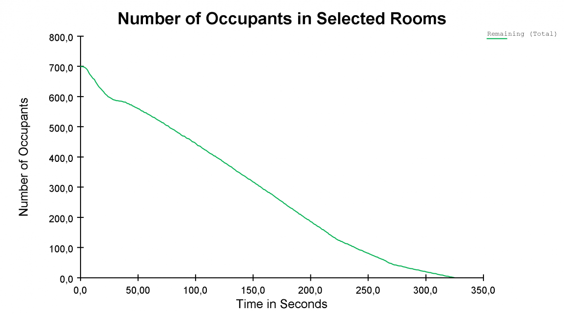 Gli output principali del software sono costituiti dalle elaborazioni grafiche tridimensionali dell’esodo, con una grafica realistica. Questi consentono di analizzare nel corso del tempo le modalità dell’esodo e di evidenziarne facilmente le eventuali problematiche, come l’impossibilità a raggiungere una determinata uscita o la formazione di code che allungano il tempo di permanenza nel comparto oggetto dell’incendio. Ulteriori output sono riportati in appositi grafici bidimensionali, come nell’immagine seguente.