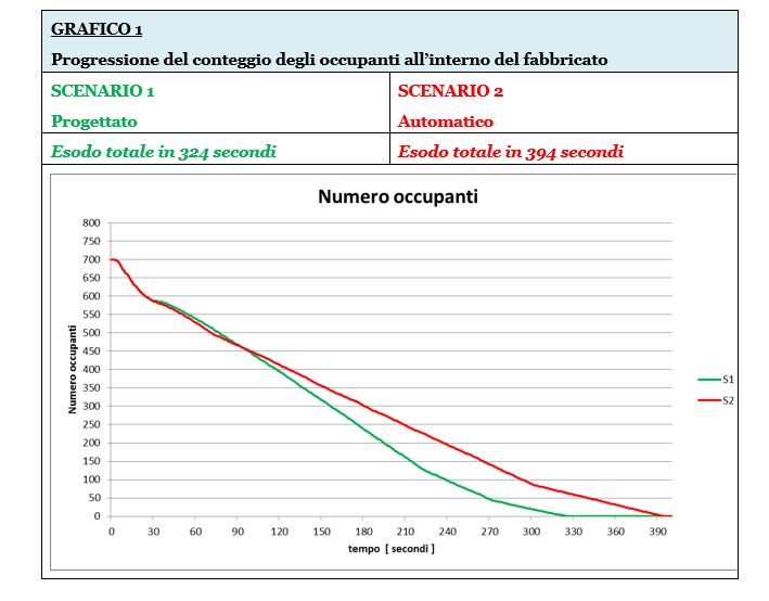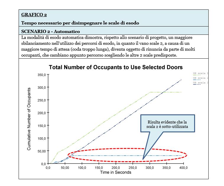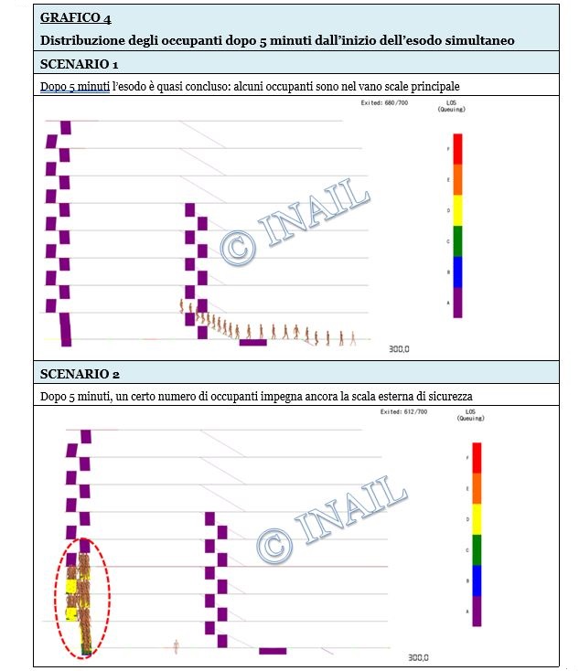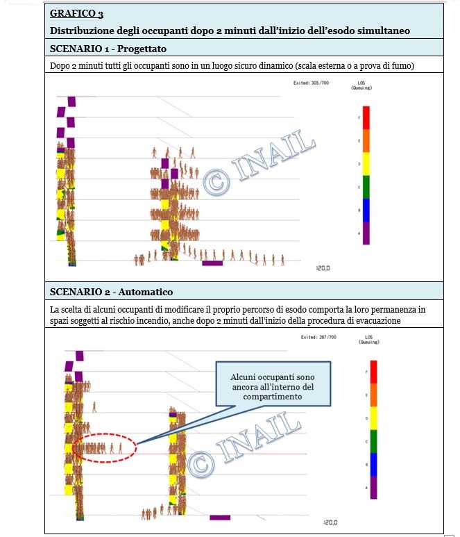 Nella pubblicazione INAIL sono rappresentati i risultati delle simulazioni di esodo eseguite per l’intero fabbricato, secondo due modalità differenti. Il software permette agli occupanti virtuali di stabilire autonomamente la via di esodo preferita (esodo automatico); in alternativa il progettista può definire a priori quale uscita deve raggiungere ciascun gruppo di occupanti (esodo progettato). Questa seconda modalità permette di analizzare l’efficacia del sistema di esodo, dal momento in cui le uscite programmate saranno quelle previste realmente nel piano di evacuazione del fabbricato. Scenario 1: esodo programmato (gli occupanti si dirigono verso le vie di esodo impostate dal progettista ed indicate con apposita cartellonistica, che corrispondono a quelle utilizzate nelle prove di evacuazione programmate). Scenario 2: esodo automatico (gli occupanti scelgono autonomamente la via d’esodo più congeniale, ovvero quella più vicina o più libera, secondo regole proprie del software e derivate dalla ricerca alla base del suo sviluppo).Analisi dell’esodo