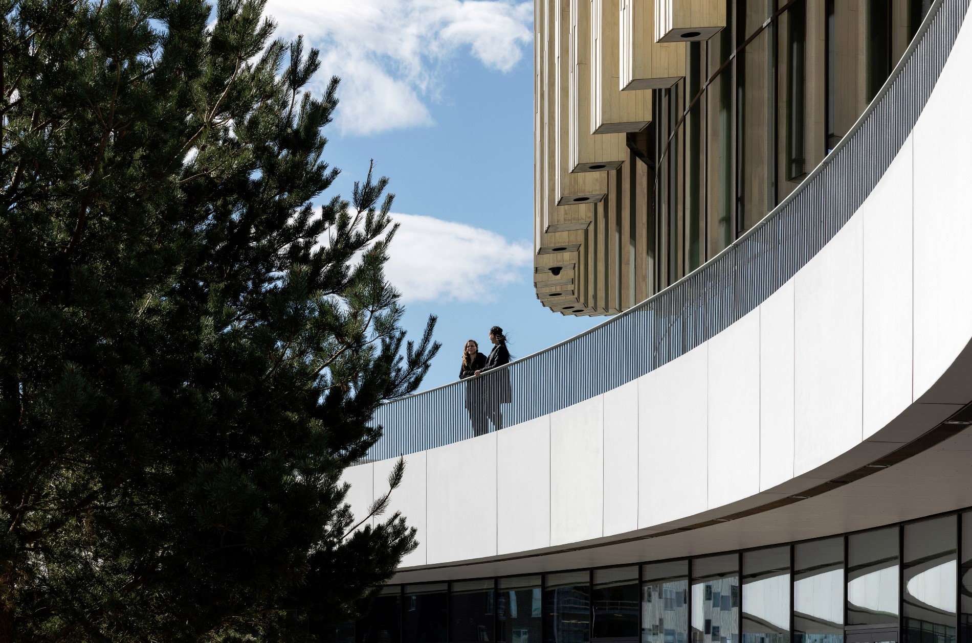 La facciata è infatti caratterizzata da superfici vetrate, schermate da un rivestimento in listelli di legno dal colore dorato che sembra ondeggiare sull’edificio con un movimento circolare, soprattutto in corrispondenza degli ingressi a segnalarne la posizione. La sua espressione nordica minimalista si adatta al quartiere circostante, così come aree verdi e piccole piazze aiutano a ridurre la scala complessiva del progetto e ad invitare le persone a socializzare. Le stesse scalinate d’ingresso forniscono posti a sedere informali con blocchi di cemento posizionati ai lati dei gradini. Accessi supplementari distribuiti lungo la circonferenza dell’edificio facilitano la congestione in caso di pubblico numeroso.