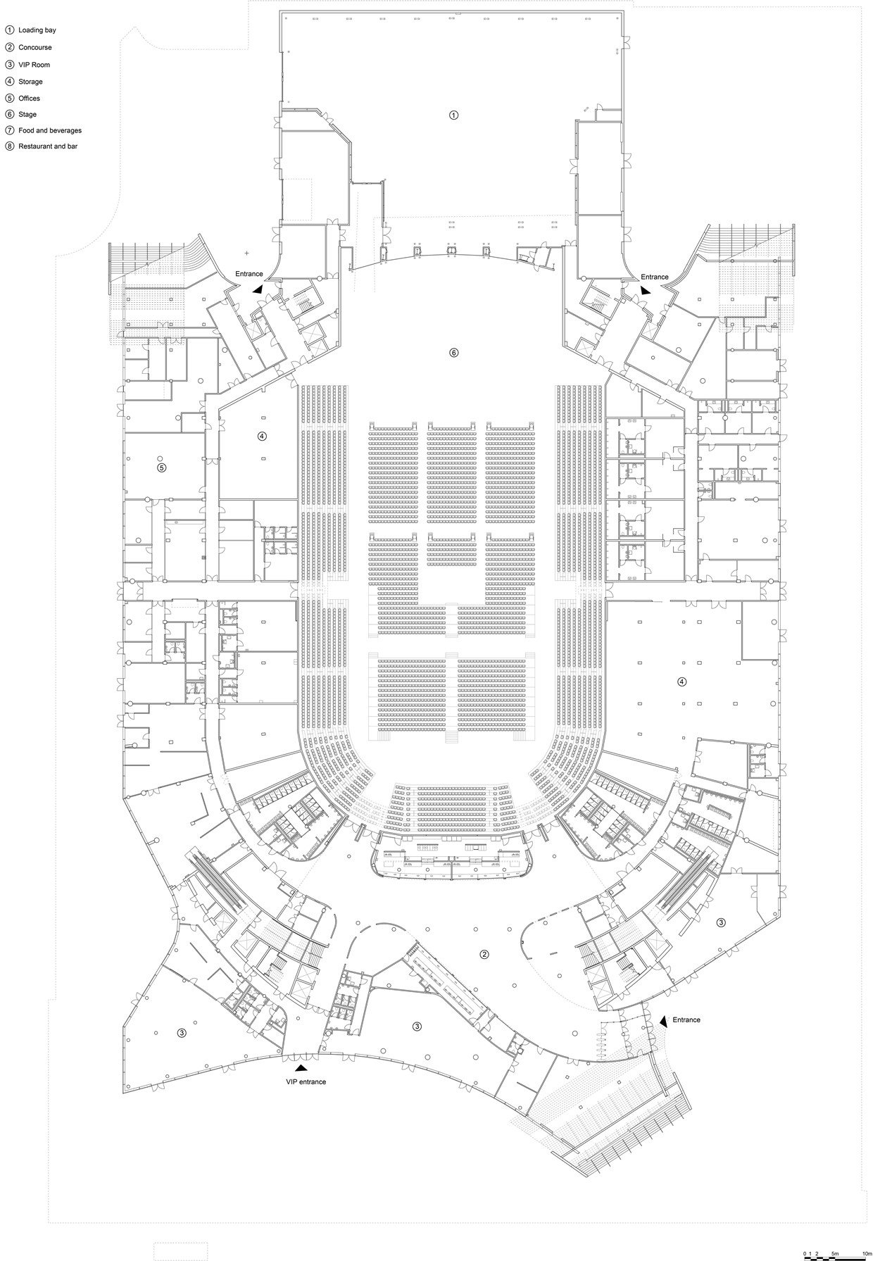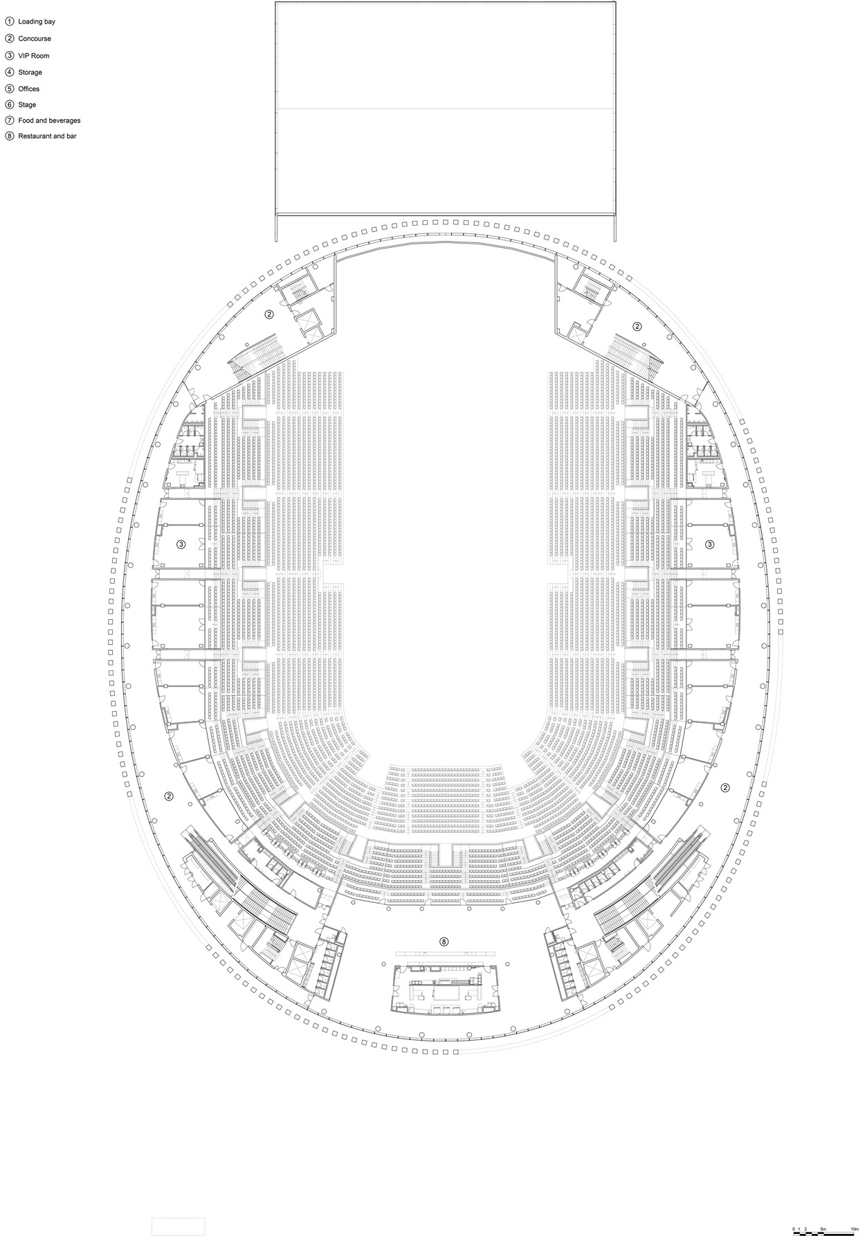 Gli architetti di 3XN (guidati dal fondatore Kim Herforth Nielsen), insieme a HSK (specializzati nella progettazione di arene sportive), hanno optato per un totale ripensamento della tipologia architettonica dell’arena, progettata per diventare un “buon vicino di casa” dal design accattivante e dalla funzionalità pubblica. Due sono gli elementi principali della struttura: un basamento che funge da collegamento tra l’edificio e i suoi dintorni, e una ciotola che poggia sopra ad una passeggiata sopraelevata e ospita all’interno la grande platea per gli spettacoli. Privilegiando una visione estetica scandinava, lontana dal blocco monolitico in cemento come negli stadi più comuni, la ciotola diventa una presenza semitrasparente e accogliente che consente agli spettatori di guardare fuori e ai curiosi di guardare dentro.