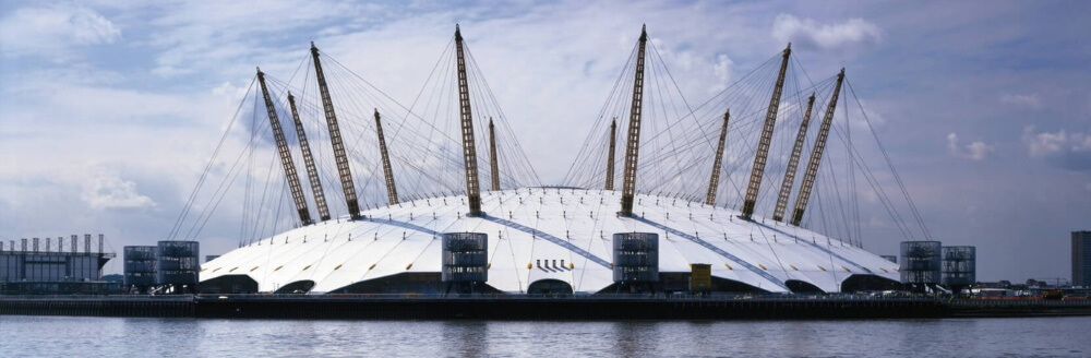 Millennium Dome, divenuta oggi O2. La grande cupola dell’arena, convertita in uno spazio multifunzionale per spettacoli ed eventi sportivi, è sorretta da 12 imponenti torri metalliche dipinte di un giallo vivace.