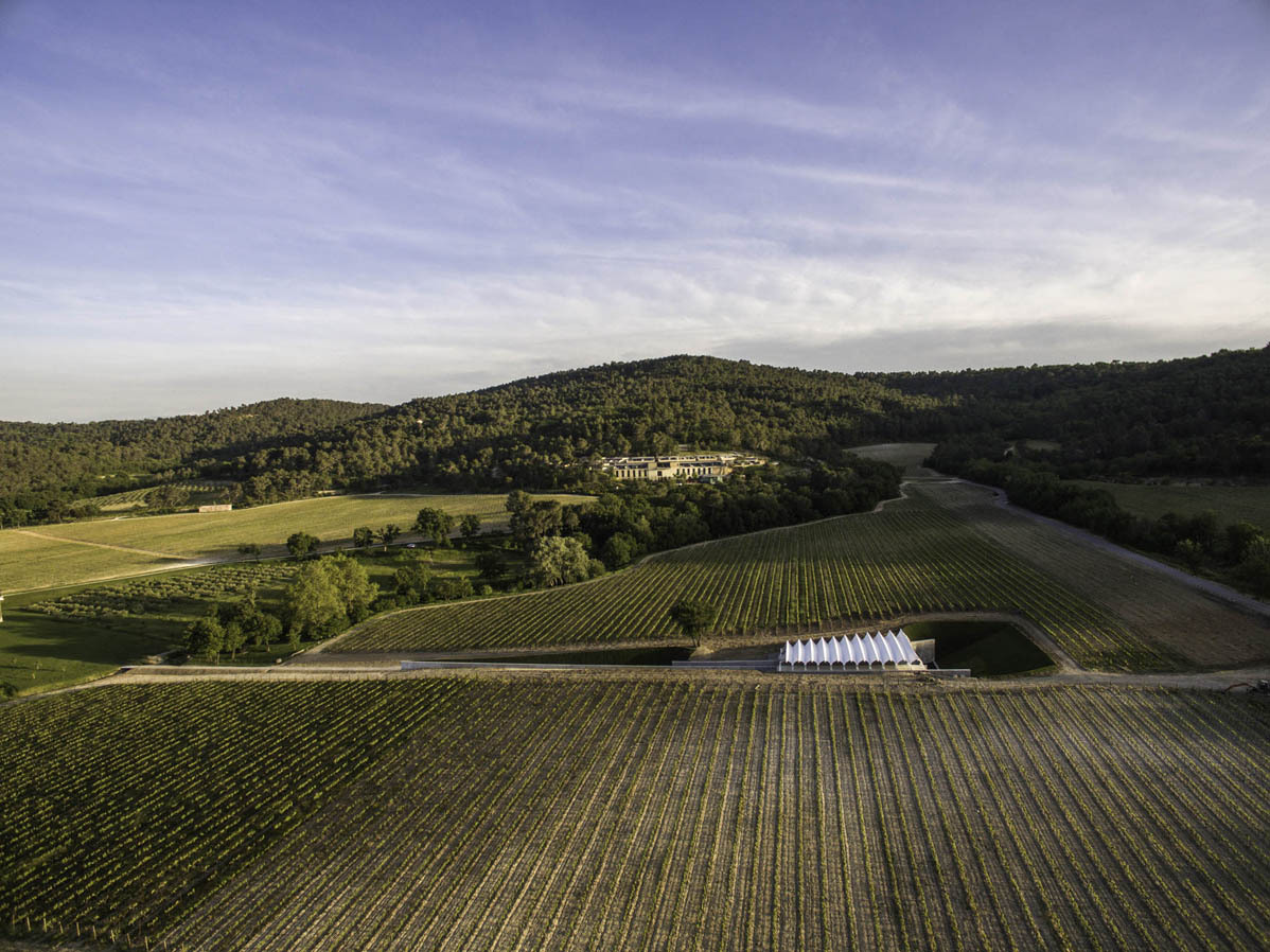 Realizzato con la collaborazione di Tangram Architectes, local architects basati nella non lontana Marsiglia, il padiglione s’inserisce in modo letterale all’interno del caratteristico paesaggio dei 200 ettari della tenuta. L’accesso è diretto dal punto di arrivo del visitatore, il castello seicentesco che dà il nome all’azienda, dal quale si dipana un percorso che, scendendo dolcemente, entra in modo graduale all’interno del terreno: la superficie di 285 mq è infatti collocata dentro uno scavo profondo 6 m che incorpora quasi completamente il volume di una teca di vetro contenuta da setti in cemento armato a vista e chiusa da un tetto a doppia falda. La planimetria è trapezoidale, stretta all’ingresso e più larga nella parte posteriore che si apre su un piccolo specchio d’acqua.