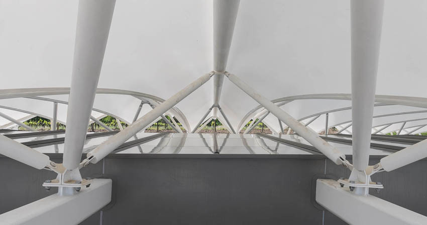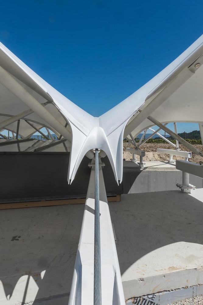La copertura esterna, leggera e separata dalla teca di vetro che protegge dalla luce diretta, è l’unica parte visibile dall’esterno del padiglione e sua caratteristica più peculiare. È una suggestiva e diafana tensostruttura bianca dalla superficie corrugata, sorretta da una struttura metallica ancorata ai setti di contenimento del terreno. Le sue linee sembrano proseguire la giacitura dei filari e, insieme alla planimetria trapezoidale, dall’alto richiama il soffietto delle antiche macchine fotografiche.