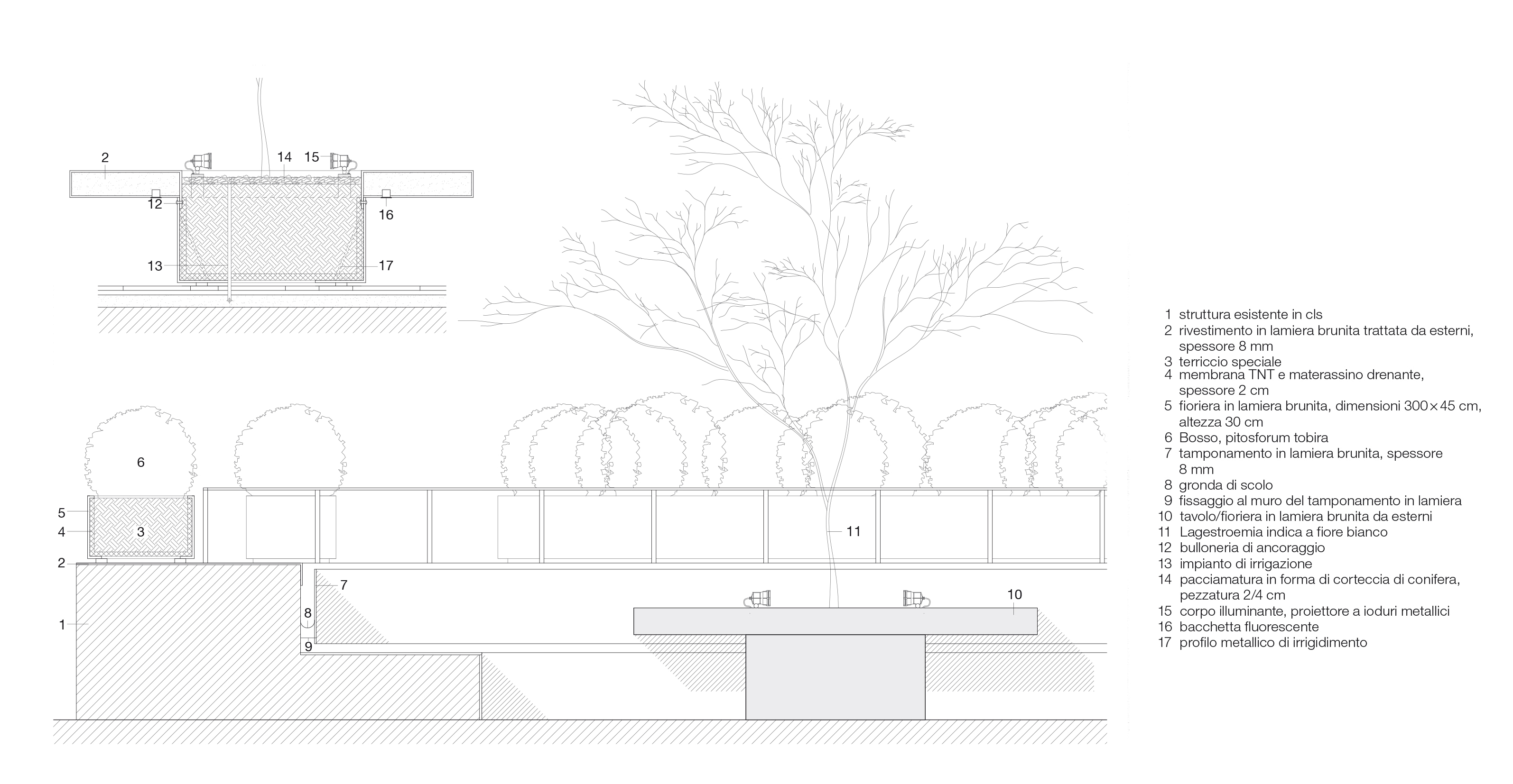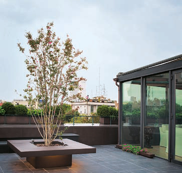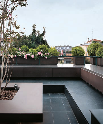 L’esempio che descriviamo è una soluzione particolare che permette di integrare, al centro di una terrazza, più funzioni in un’unica struttura, realizzando in questo modo un elemento d’arredo funzionale ed esteticamente molto godibile. Oltre alla sistemazione con sedute e luci lungo il contorno dello spazio terrazza, è stato collocato in posizione centrale un tavolo con al suo interno lo spazio per l’alloggiamento di un elemento vegetale, nello specifico un albero.