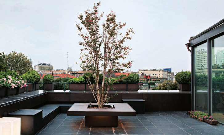 Arredare una terrazza con un tavolo fioriera che accoglie un albero