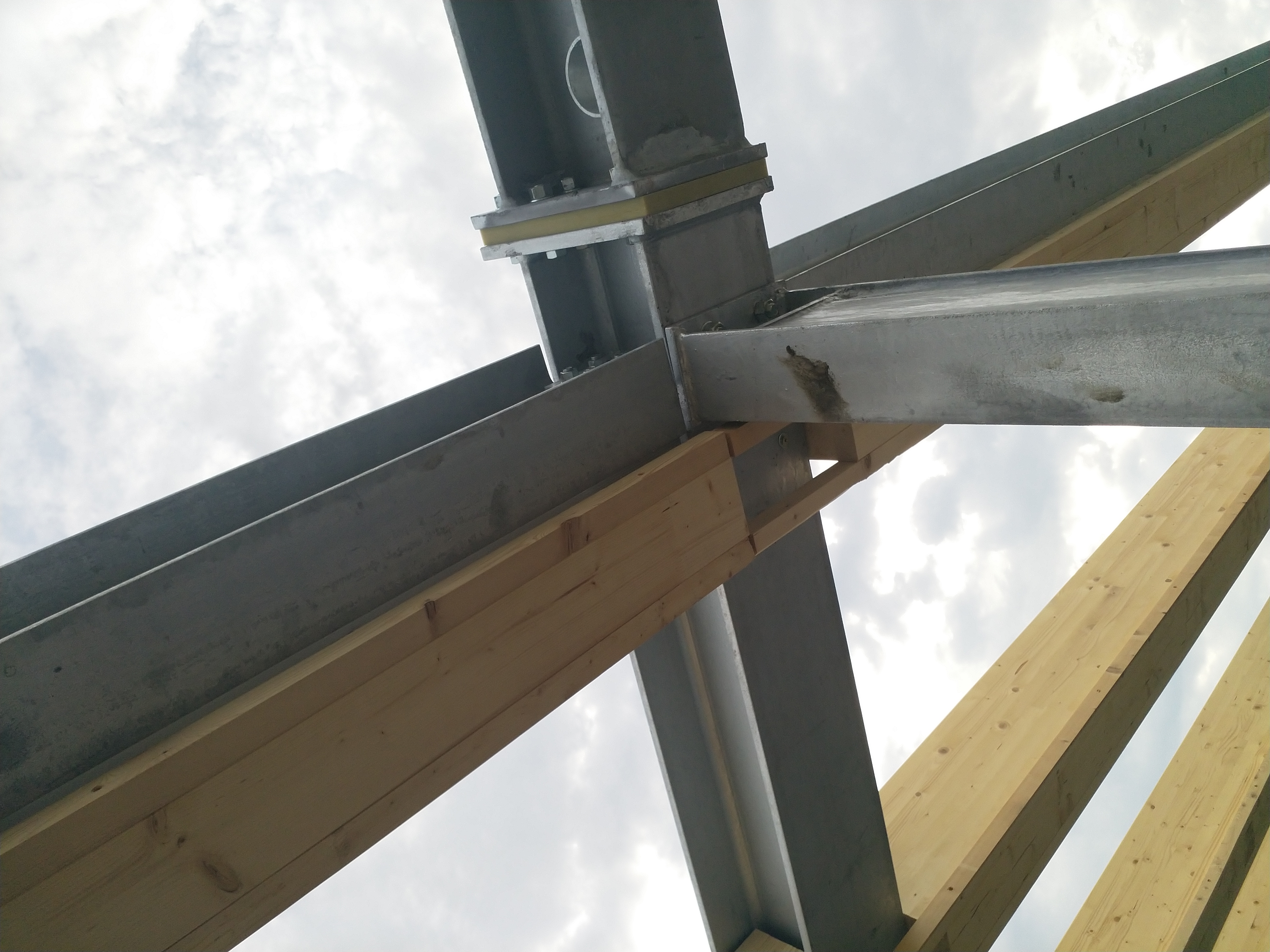 - gli aggetti (fino a 5 m di luce) sono termicamente interrotti mediante l’interposizione di un giunto a flangia, corredato di una piastra in materiale di sintesi, interposto tra le due flange metalliche, in grado di trasferire il carico ma con elevata resistenza al trasferimento del calore.