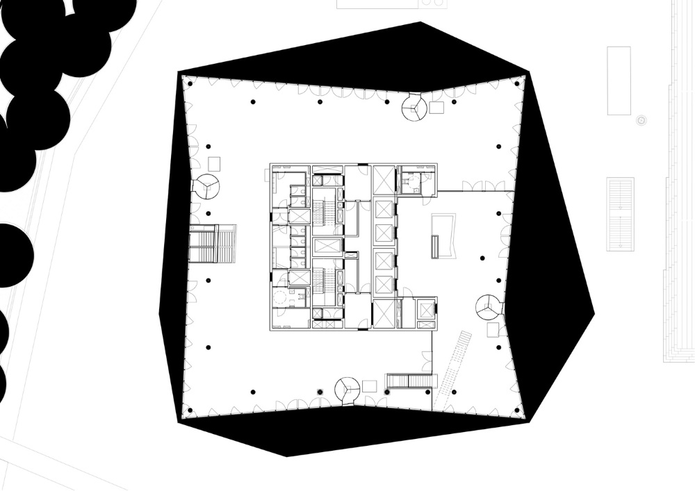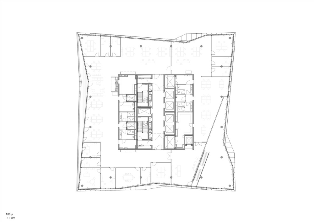Il restante spazio viene occupato da uffici e aree di lavoro che possono essere spazi open space o singoli. L’ampia flessibilità è garantita da una struttura portante che, concentrata al centro e distribuita lungo il perimetro, libera gli interni. L’organizzazione planimetrica permette a tutti gli spazi di lavoro di ricevere abbondante luce naturale.