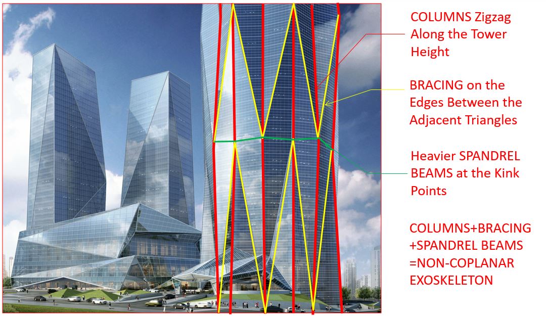 Introducendo un mega elemento diagonale tra ogni coppia di colonne, la superficie viene così suddivisa in 2 sotto-superfici planari. Queste ultime seguono anch’esse l’articolarsi delle differenti zone, accompagnando così l’andamento a zigzag proprio dell’altezza della torre. Dunque, esse forniscono non solo supporto ai montanti delle facciate continue, ma assolvono anche all’importante ruolo di componente del sistema strutturale perimetrale. Il prodotto finale che se ne ricava è un sistema ad esoscheletro di tipo tridimensionale, non planare, in grado di adattarsi perfettamente alle superfici indicate dal progetto architettonico. Infine, una terna di travature reticolari, disposta a distanza regolare rispetto la sezione longitudinale della torre, connette l’esoscheletro esterno al nucleo in cls armato, incrementando ulteriormente l’efficienza del sistema laterale.