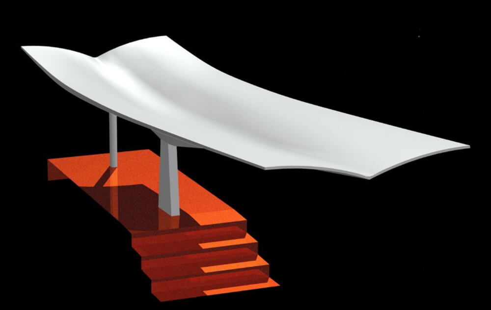 volte a vela a iperboloide. Sono tutte a doppio sbalzo, uno verso la pista e uno verso la parte posteriore. Nella parte anteriore lo