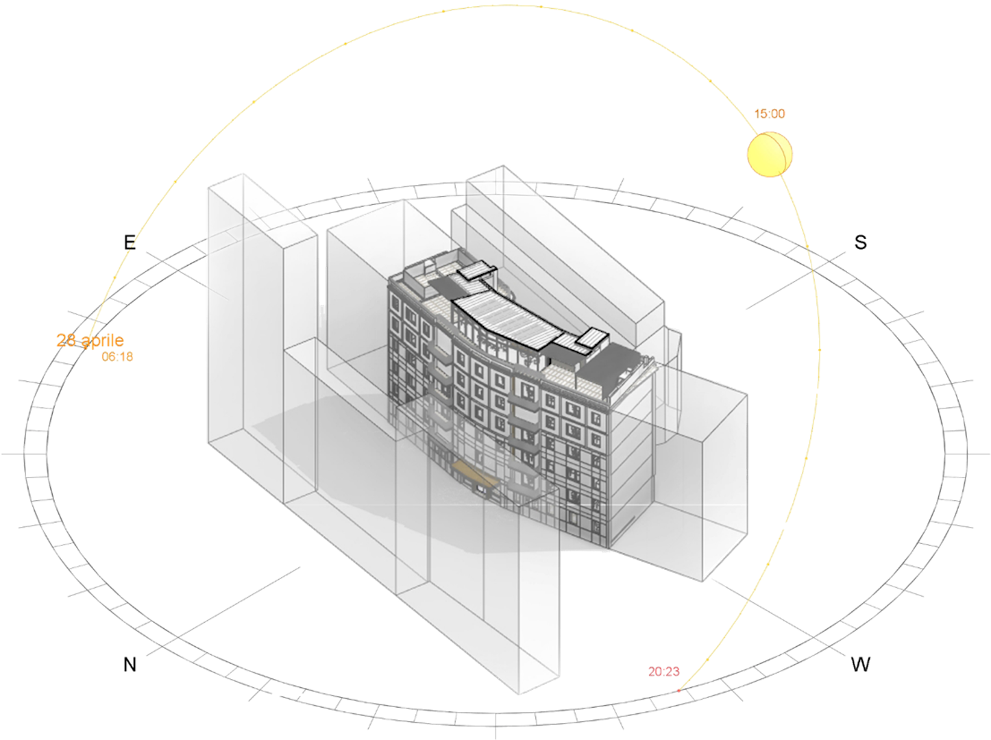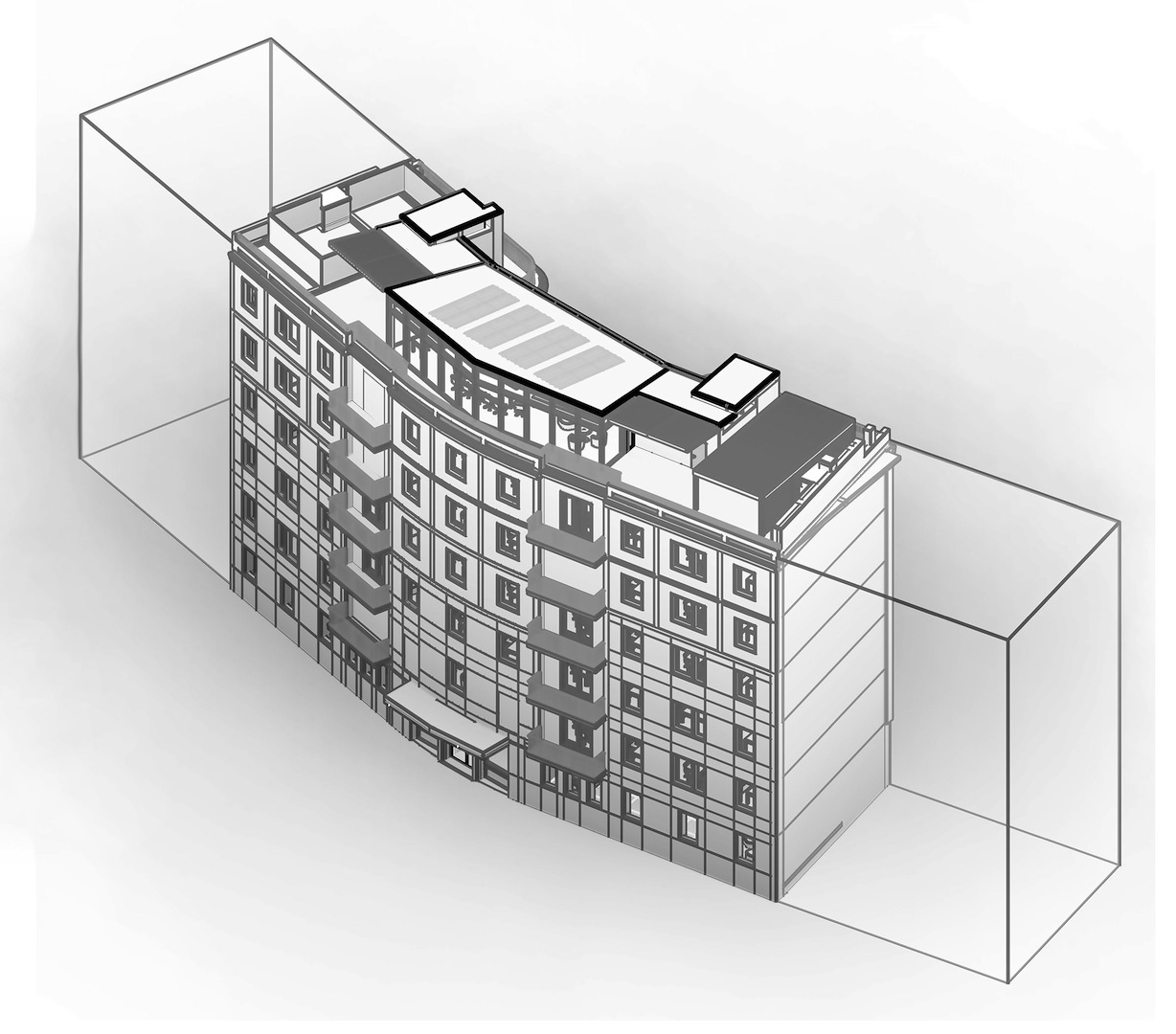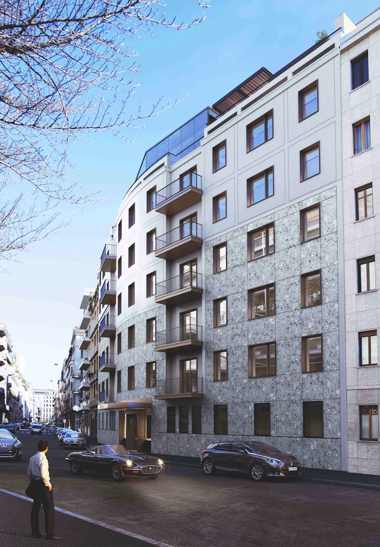 Si sono conservati sulla via dell’Annunciata quei caratteri tipologici tipici del razionalismo italiano (finitura a intonaco fugato, serramenti ad oblò nel basamento, volumi curvi e piani differenti di facciata) sui quali innestare l’elemento di novità trasparente che si sviluppa verso il cielo andando ad occupare gli spazi lasciati liberi da terrazze e copertura.