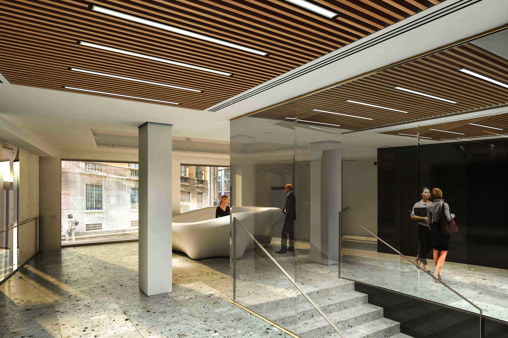 A oggi l’edificio presenta un unico ingresso su via Fatebenefratelli piuttosto anonimo e quindi di difficile riconoscibilità. Nel progetto, l’ingresso principale si allarga con l’introduzione di nuove vetrine utili a percepire la profondità.