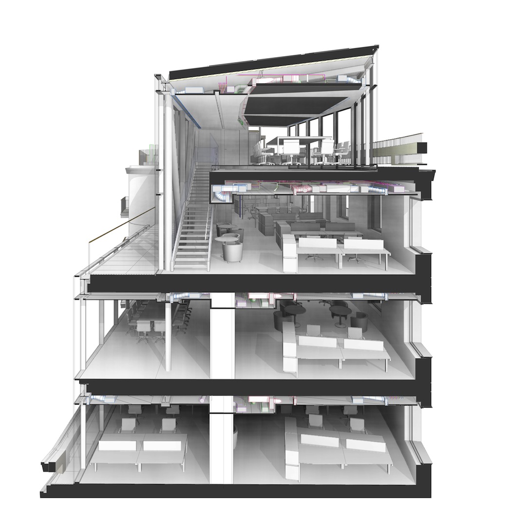 L’elevata complessità del progetto, che ha previsto la demolizione e la ricostruzione di parti dell’edificio esistente, nonché l’alterazione di volumi e l’adeguamento strutturale/impiantistico, ha tratto grande beneficio da un design workflow basato sul coordinamento in tempo reale tra le varie discipline coinvolte nella progettazione, attraverso l’adeguamento alle normative vigenti (barriere architettoniche, adeguamento sismico, prevenzione incendi, riqualificazione energetica), valorizzando l’immobile dalla peculiare collocazione urbana e potenzialità volumetrica.