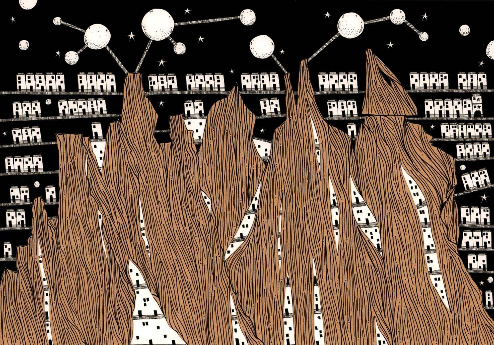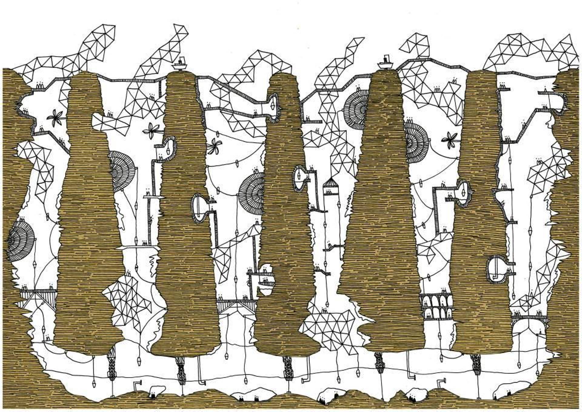 Nel suo progetto, l’architetto peruviano Karina Puente, appassionata di città, di disegno e lettura, ha messo tutte le sue passioni, interpretando con 6 disegni Le Città invisibili, la novella pubblicata nel 1972 da Italo Calvino. Il libro narra di conversazioni immaginarie tra l’esploratore veneziano Marco Polo e il governatore della Mongolia kublai Khan ed è stato determinante nell’elaborazione di un discorso attuale sullo sviluppo urbano. Per le sue illustrazioni, Karina Puente non ha realizzato solo disegni, ma ha utilizzato diversi tipi di carta e matite, per poi ritagliarle. Ciascun disegno ha la sua sorta di “profondità”, dunque, in quanto composto da strati di carta ritagliati e incollati.
