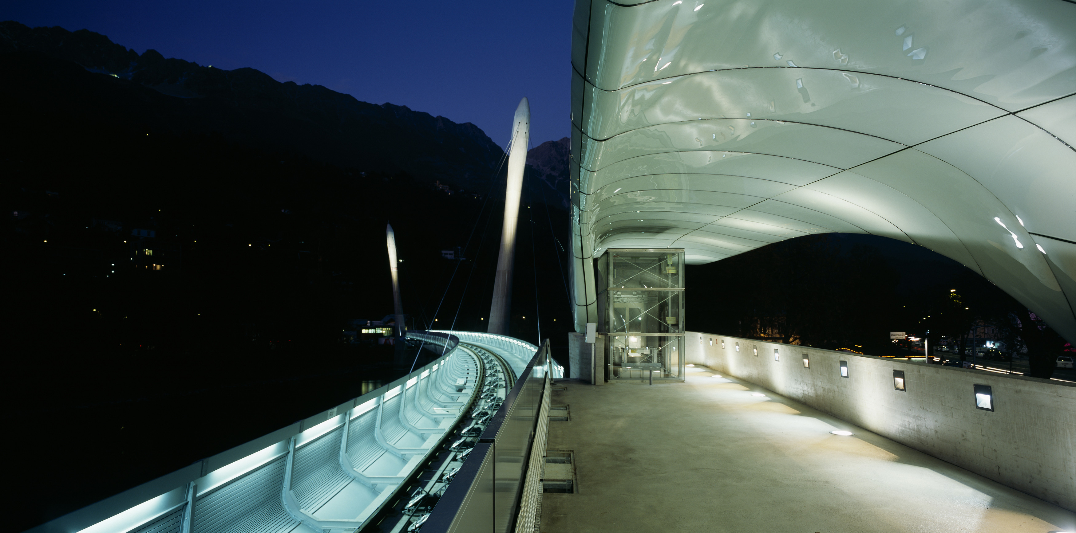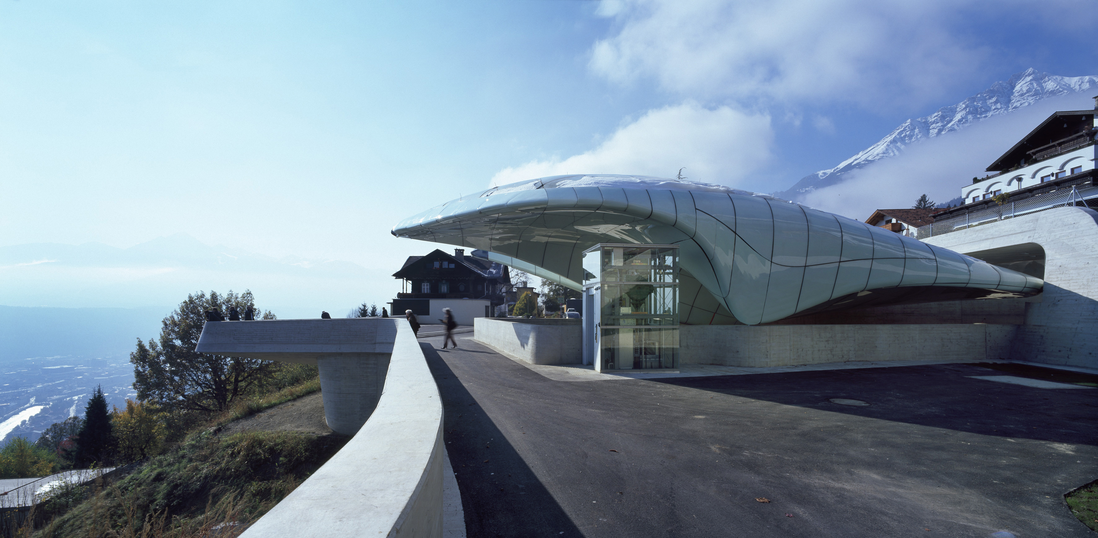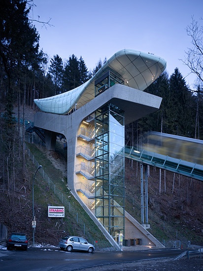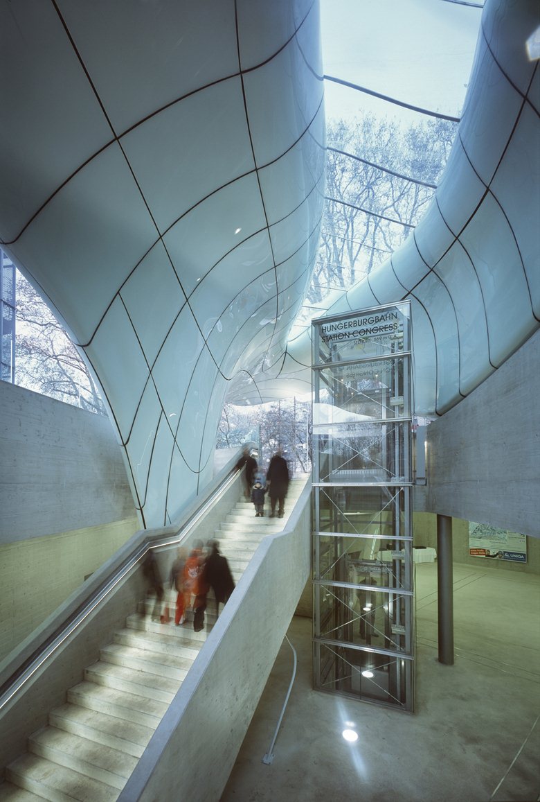 Nel progettare le nuove stazioni a servizio della funicolare di Innsbruck, completate nel 2007, Zaha Hadid ha plasmato strutture avveniristiche caratterizzate dalle cosiddette ‘nuvole di vetro’, coperture curve e riflettenti che si adattano alle condizioni specifiche del sito alle varie altitudini, seguendo un linguaggio architettonico comune ispirato alla formazione naturale dei ghiacciai. Il progetto si compone di quattro stazioni e un ponte sospeso sul fiume Inn, realizzati lungo il tracciato della funicolare che conduce in meno di mezz’ora sulle catene montuose di Innsbruck (1,8 km).