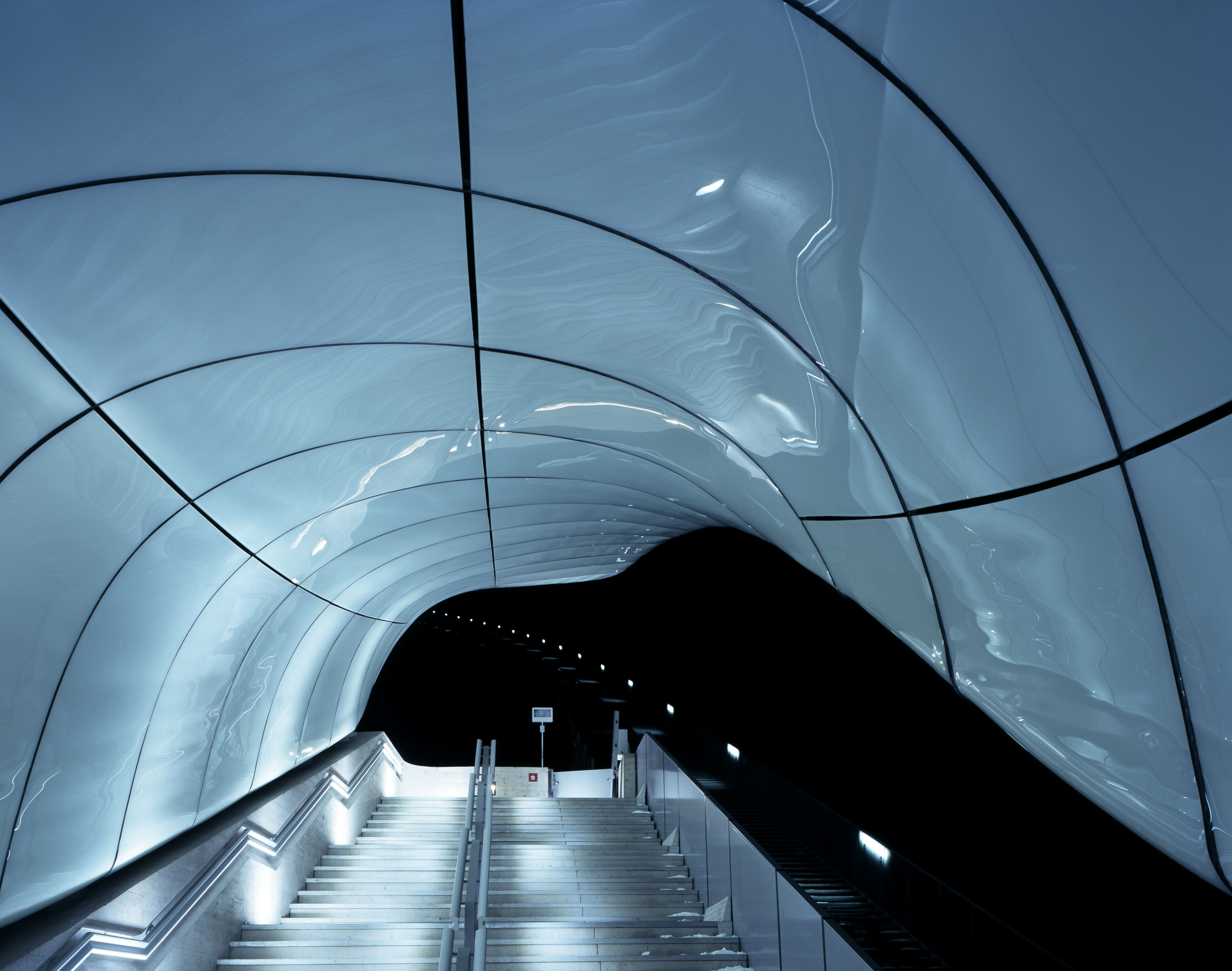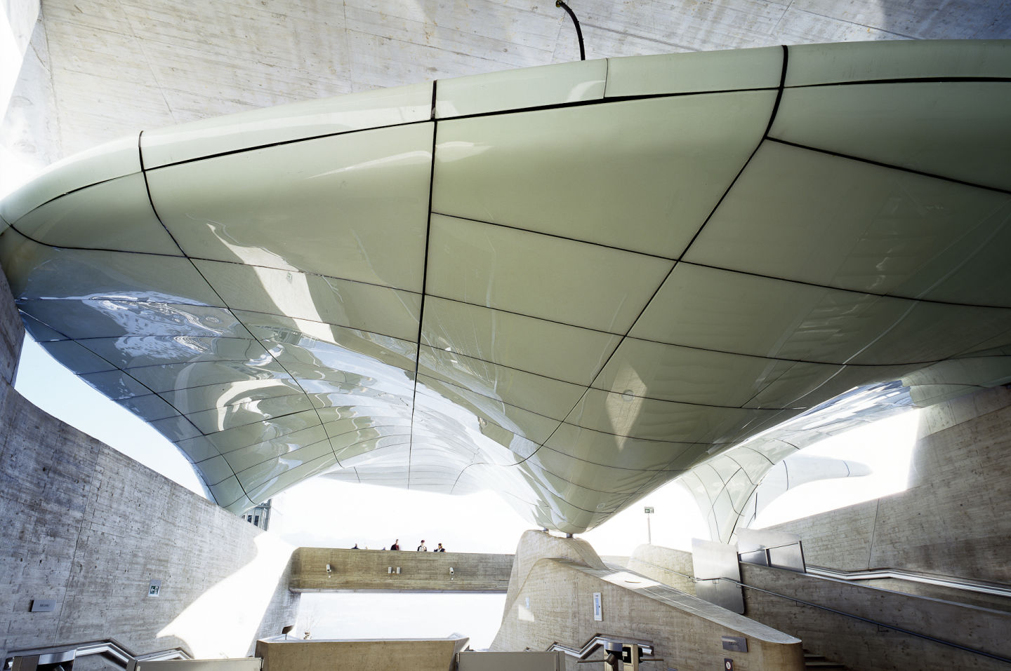 Definite da geometrie concave e convesse, queste pensiline riflettono il movimento e la topografia del terreno e appaiono come sculture di ghiaccio che galleggiano al di sopra di un basamento in cemento. Realizzate con un rivestimento di pannelli in vetro trattati con una resina poliuretanica, le superfici delle coperture sono bianche, lucide, riflettenti e molto resistenti. Per ottenere la massima fluidità geometrica Zaha Hadid ha inoltre sperimentato l’uso del vetro a doppia curvatura con metodi innovativi come la termoformatura del vetro e la fresatura automatizzata che hanno garantito una traduzione molto precisa del disegno generato dal computer alla realtà costruita. Ogni copertura a forma di nuvola presenta una struttura interna in acciaio studiata con particolari sistemi di ancoraggio che hanno permesso di ridurre al minimo le fughe tra i pannelli, evidenziate con strisce in silicone nero per sottolineare ulteriormente la curvatura delle forme. Pochi sono i punti d’appoggio tra lo scheletro in acciaio e il basamento in cemento; questo conferisce un senso di leggerezza alle strutture, definite da ampi sbalzi protesi verso la natura. La qualità spaziale di ogni stazione è enfatizzata dal contrasto tra due elementi che l’architetto stesso definì ‘Shell and Shadow’, una combinazione di gusci che crea un gioco di chiaro-scuro.