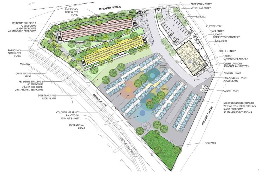 L’Hilda L. Solis Care First Village è un complesso prefabbricato che occupa un terreno di poco più di 1,5 ettari (4 acri). Realizza un totale di 232 posti letto proponendo un modello ibrido di ospitalità a breve termine con due differenti soluzioni di residenzialità. 100 sono infatti posti letto temporanei, posizionati dentro 20 strutture bianche mobili in legno prefabbricato facilmente smantellabili per essere riposizionate. I restanti 132 sono abitazioni minime e provvisorie, pensate per un’ospitalità di medio periodo realizzate all’interno di 66 container metallici riadattati.
