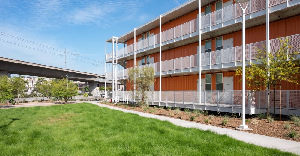 L’Hilda L. Solis Care First Village realizza su progetto di NAC Architecture un complesso da 232 posti letto realizzato in 5 mesi per differenti gestioni degli homeless