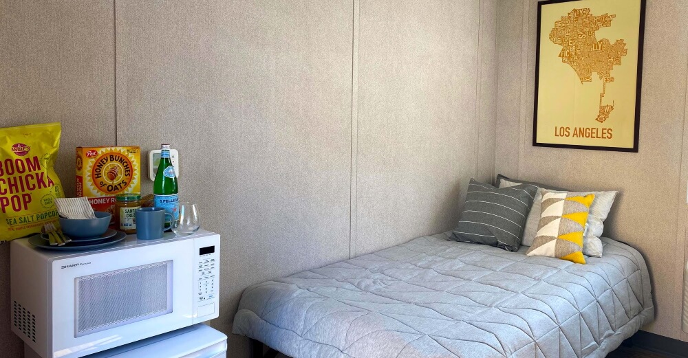 I container, elementi che i progetti di architettura spesso hanno riutilizzato per molte e differenti destinazioni d’uso, costituiscono i moduli di due edifici separati alti tre piani fuori terra. Impilati l’uno sull’altro e posati su due basi di cemento armato, formano i volumi affiancandosi, separati da uno spazio vuoto. I 66 container utilizzati sono stati completamente coibentati e allestiti internamente nella vicina Carson dagli stabilimenti di Crate, azienda specializzata nel loro recupero e riutilizzo architettonico. Ognuno è in grado di accogliere due persone con spazi privati in unità residenziali minime, completamente arredate e dotate di servizi, anch’essi minimi. La superficie di ognuna è pari a circa 15 mq dotati di un letto, un forno a microonde, un mini-frigo, un televisore a schermo piatto e un piccolo bagno privato. Le stanze sono tutte riscaldate e raffrescate e illuminate da una piccola finestra.