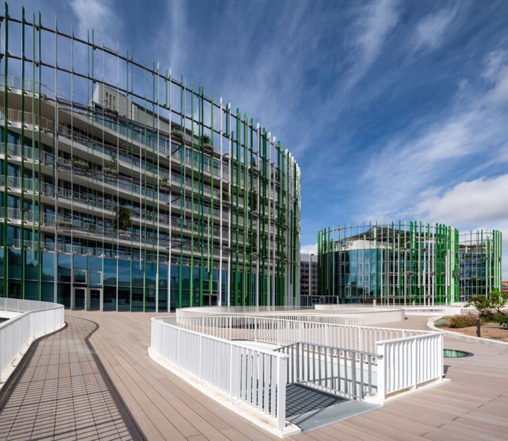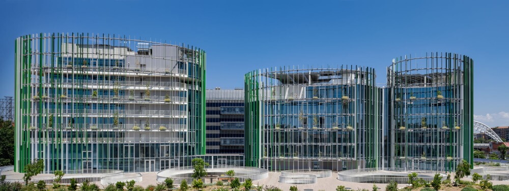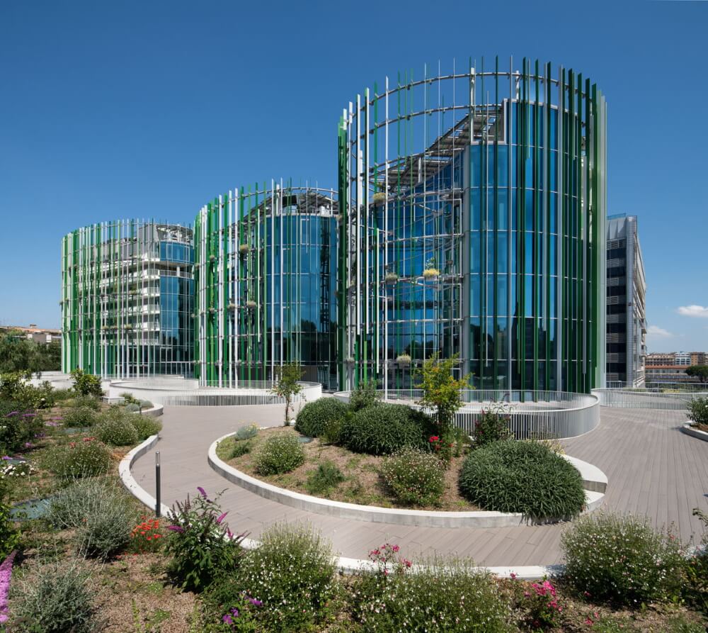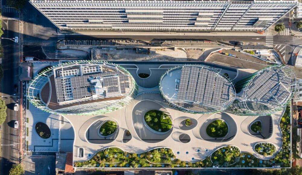 verde è elemento importante della sostenibilità del progetto. Ha previsto la realizzazione di giardini e isole vegetali sia a livello stradale che pensili sulla piazza sopraelevata. Si affiancano al verde rampicante che nel prossimo futuro sfrutterà i montanti metallici verticali per crescere favorendo il raffrescamento passivo degli interni. Il suo mantenimento e la sua irrigazione sono garantiti dal recupero delle acque meteoriche, stoccate all’interno di serbatoi sotterranei.
