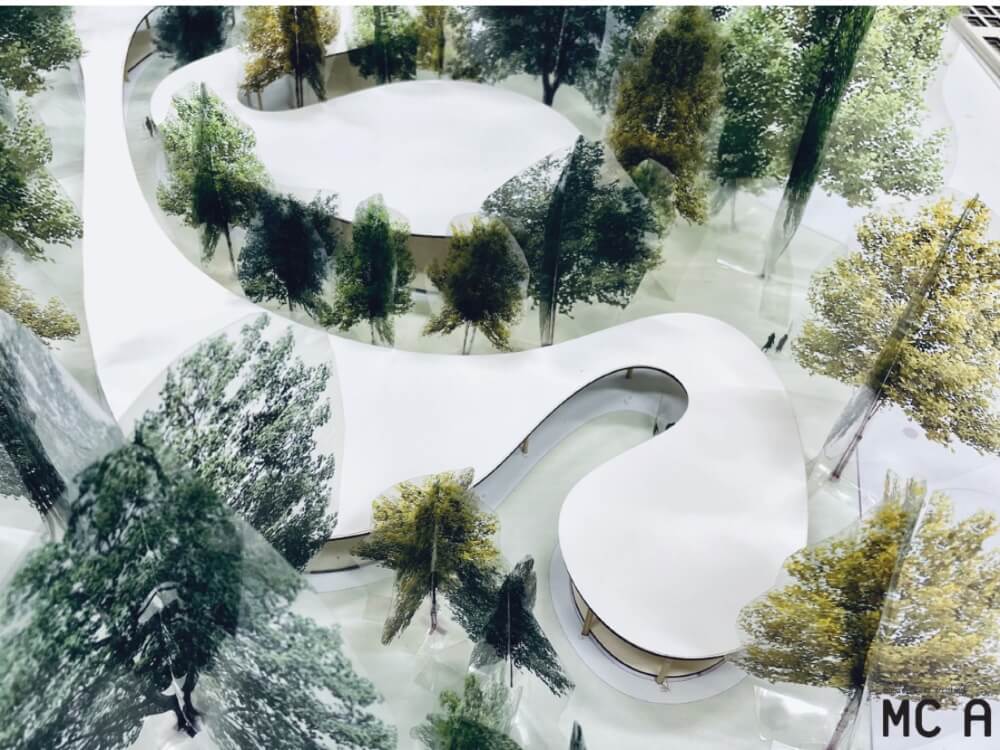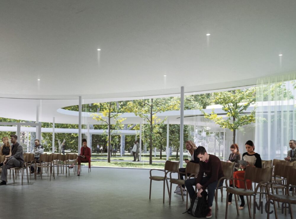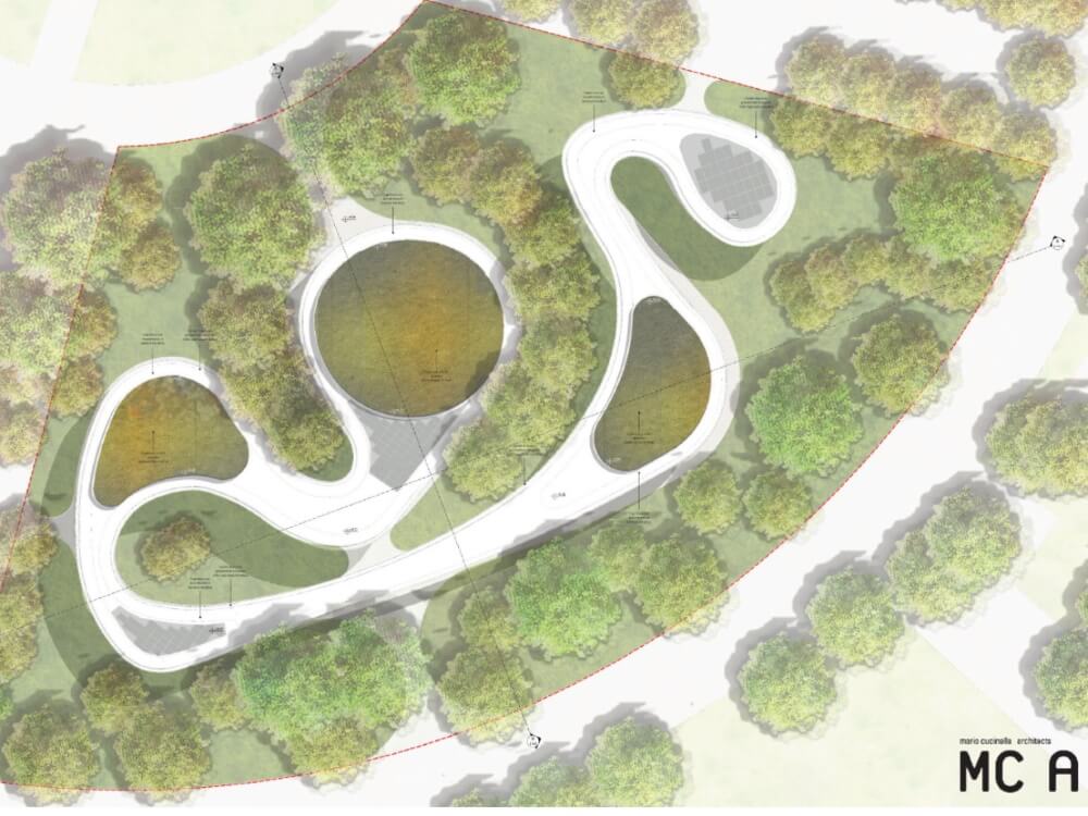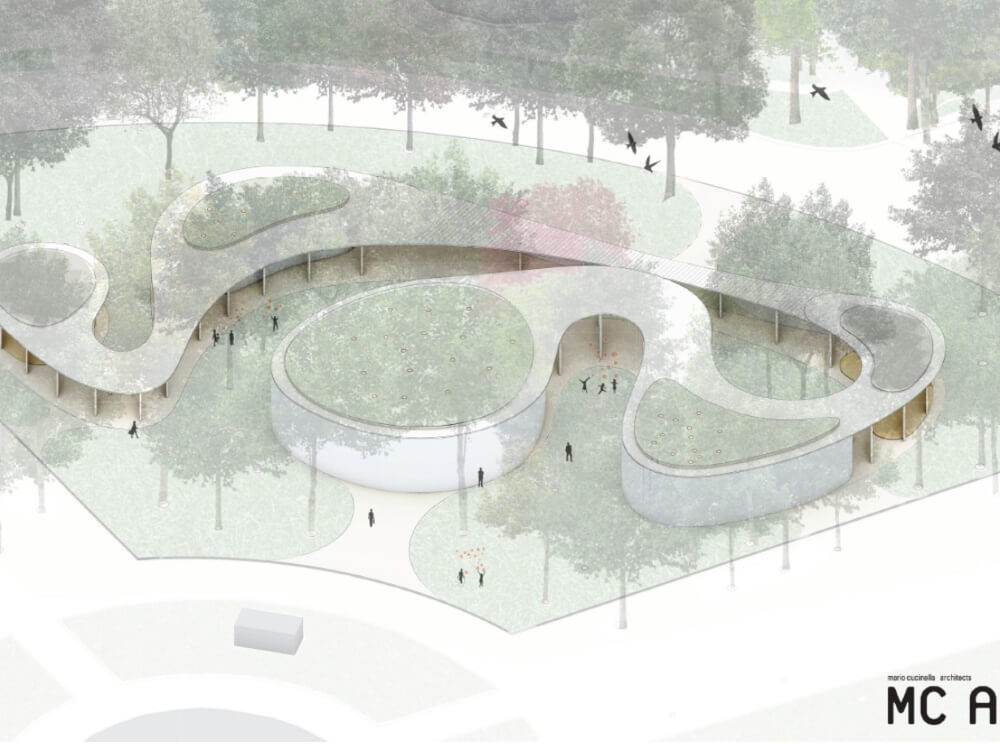 tre padiglioni vetrati a un piano fuori terra, che si poseranno tra i fusti degli alberi del parco come “una foglia bianca”. Realizzeranno