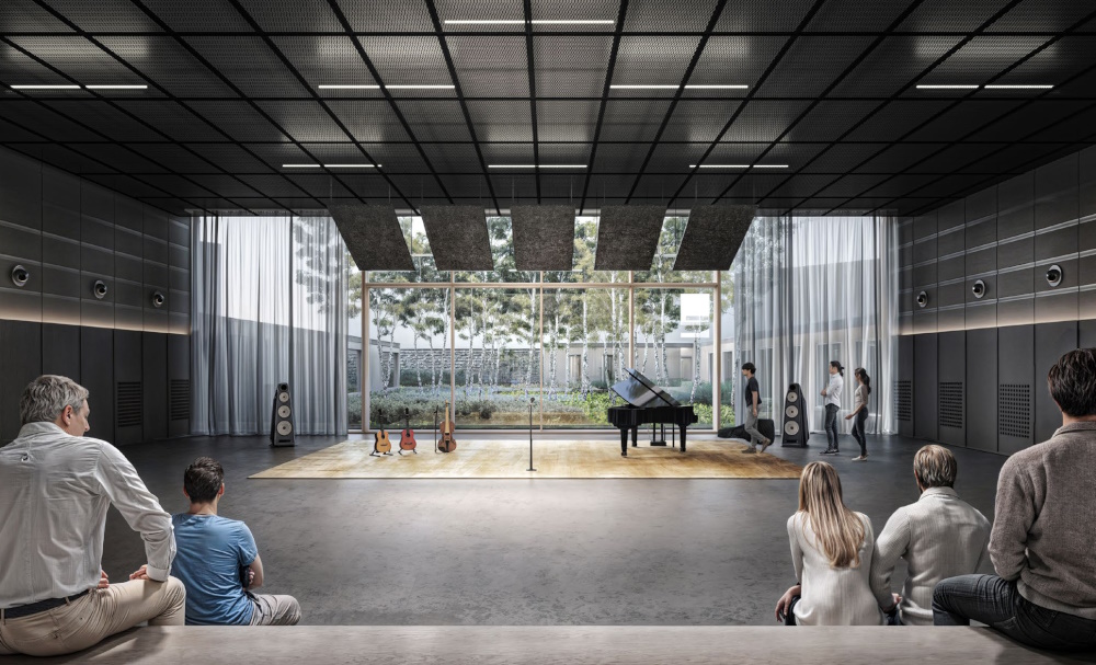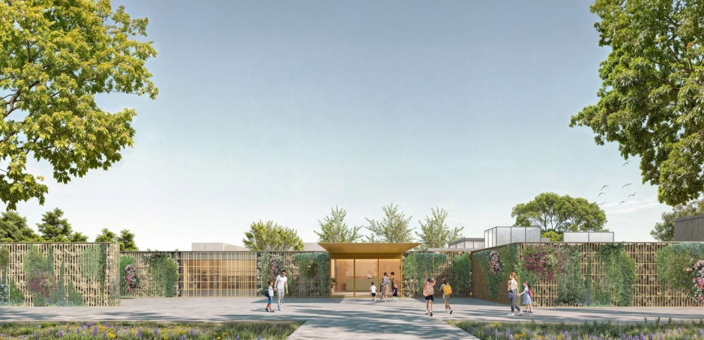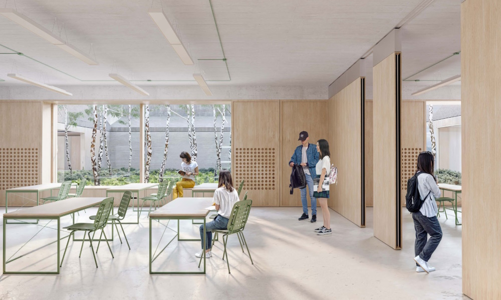 Gli edifici, a un piano fuori terra, sono costruiti attorno a cortili verdi aperti che favoriscano la socializzazione, l’apprendimento all’aria aperta e anche il benessere psicofisico. Le aule vi si aprono accessibili da corridoi che possono espandere lo spazio dell’apprendimento, massimizzando al contempo l’uso dello spazio. Grandi e trasparenti aperture connettono gli interni con l’esterno e introducono grandi quantità di luce naturale.