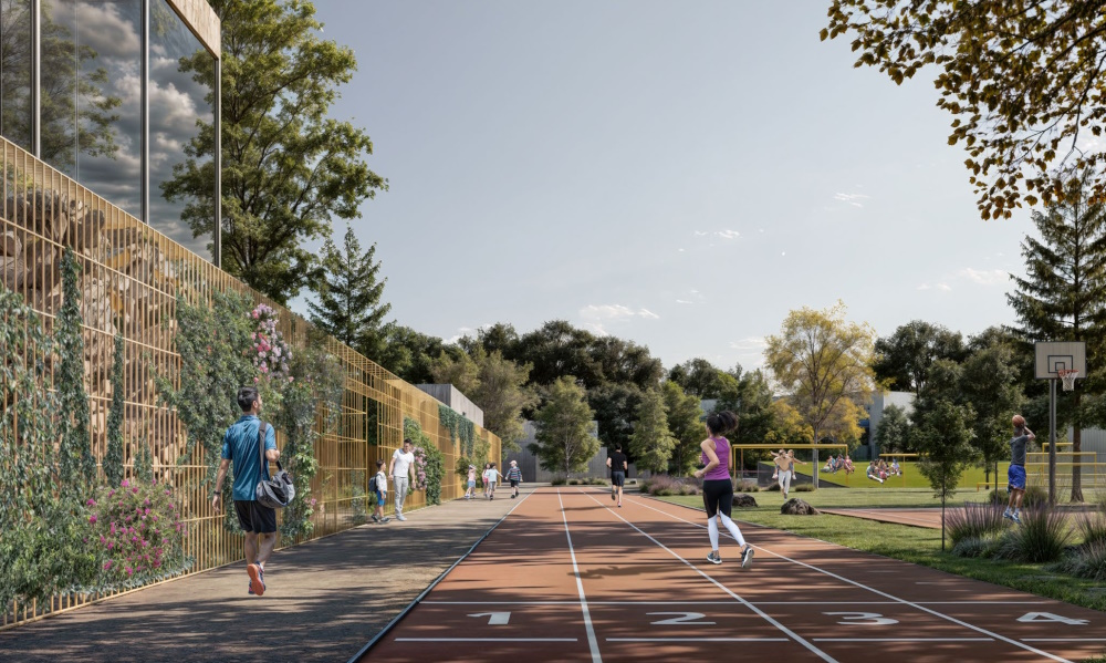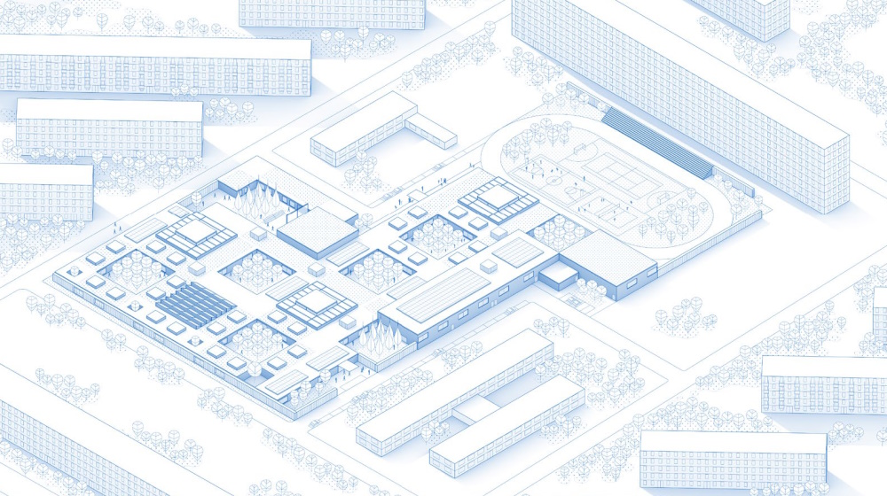 La configurazione di base si estende su oltre 10.000 mq che includono spazi educativi e ricreativi per tre livelli scolastici (dalla primaria alle superiori). Comprendono anche superfici destinate alla comunità, con aree per la cura e le attività di protezione civile.