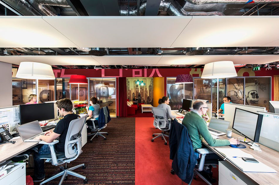 Trasformata in un luogo eccentrico anche la sede di Google ad Amsterdam, in seguito al vitale restyling eseguito nel 2014 su progetto dello studio olandese D/Dock. I graffiti sui muri in mattone, le luci a forma di scatola di cartone e la sala conferenze concepita come un container, traggono ispirazione dal tema grunge del garage, nel ricordo della rimessa in cui i fondatori Larry Page e Sergey Brin hanno lanciato la piattaforma sul web. Dettagli tipicamente olandesi arricchiscono l’atmosfera: i pannelli appesi al soffitto sono a forma di stroopwafel, i disegni bianchi e blu provengono dalla ceramica di Delf, la reception è concepita come un porta biciclette e una roulotte degli anni sessanta è adibita a sala riunioni.