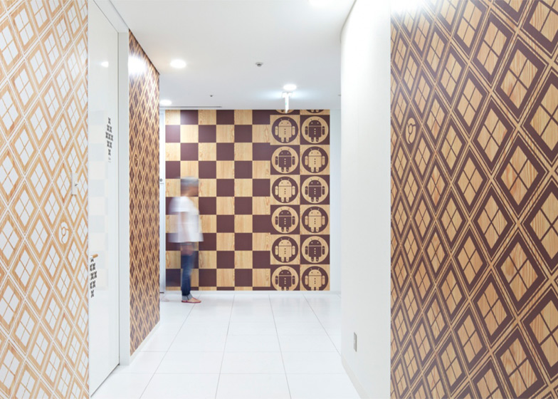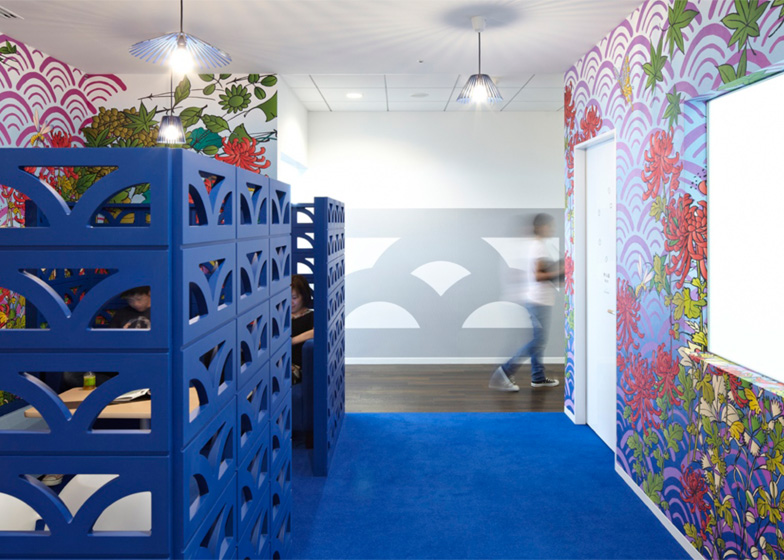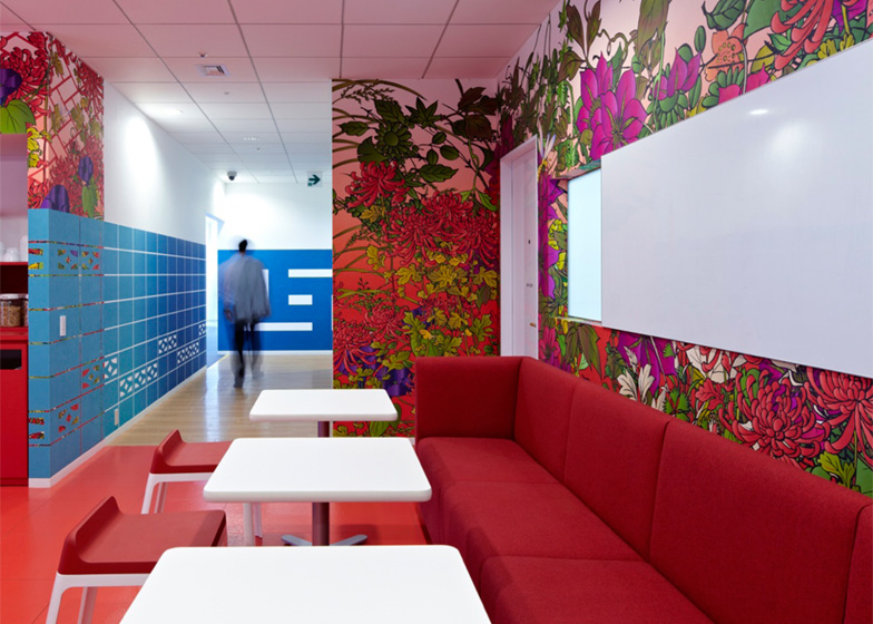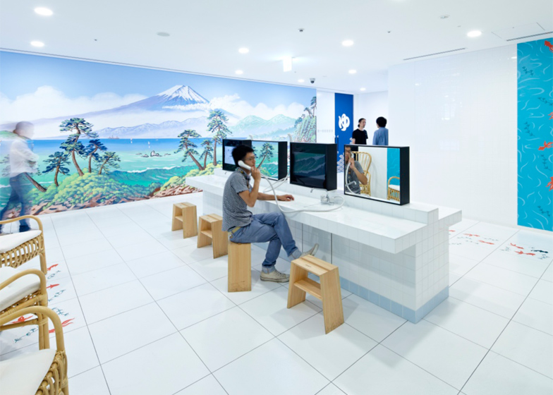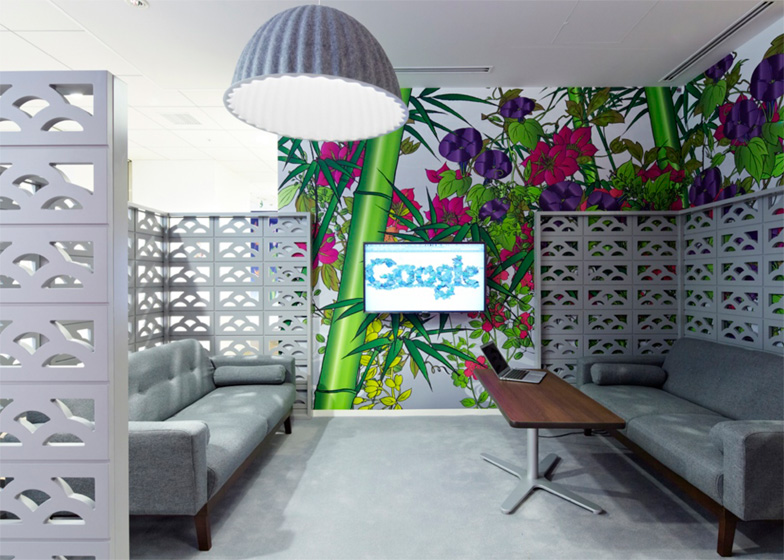 Anche gli uffici di Tokyo vogliono comunicare il contesto giapponese senza ricorrere a clichè, attraverso il progetto dello studio Klein Dytham Architecture. Ad ogni zona è stato assegnato un colore e molte pareti sono ricoperte da immagini digitalizzate che evocano la tradizione del Giappone. Alcuni salotti informali, circondati da pareti in blocchi di calcestruzzo forati, riportano alla grafica floreale dai colori vivaci, mentre altre sale riunioni celebrano la festa più popolare del paese denominata Matsuri con immagini forti in cui dominano i colori blu e arancio delle vesti; una carta da parati con motivi geometrici richiama invece la tradizione dell’architettura in legno. Un dipinto murale del Monte Fuji, creato appositamente per Google, avvolge una parete della sala di presentazione e formazione allestita come i memorabili bagni pubblici del Giappone, oggi scomparsi, con piastrelle in ceramica bianche, sgabelli in legno e schermi di computer come specchi. Infine uno stagno di carpe koi digitale risponde a sensori nascosti e proietta i pesci verso coloro che entrano.