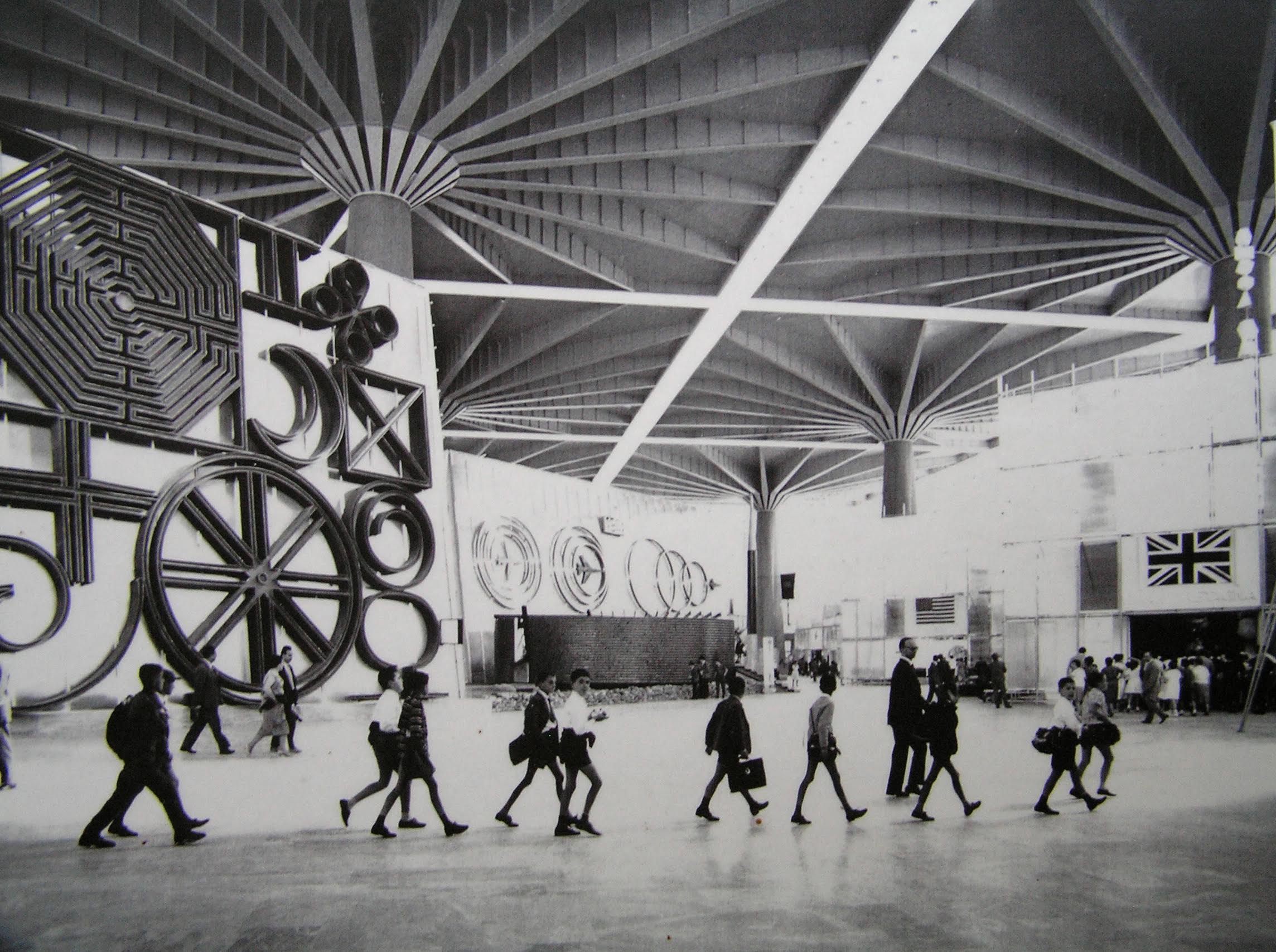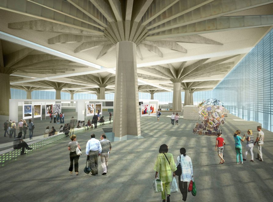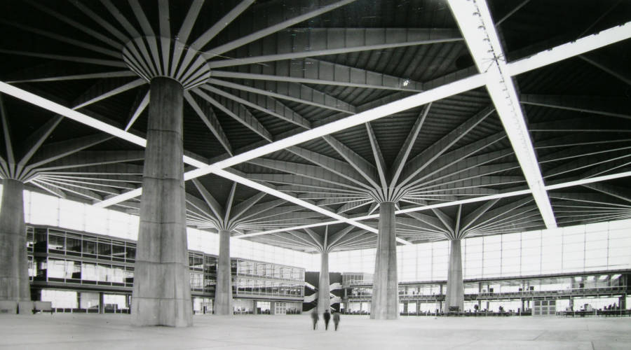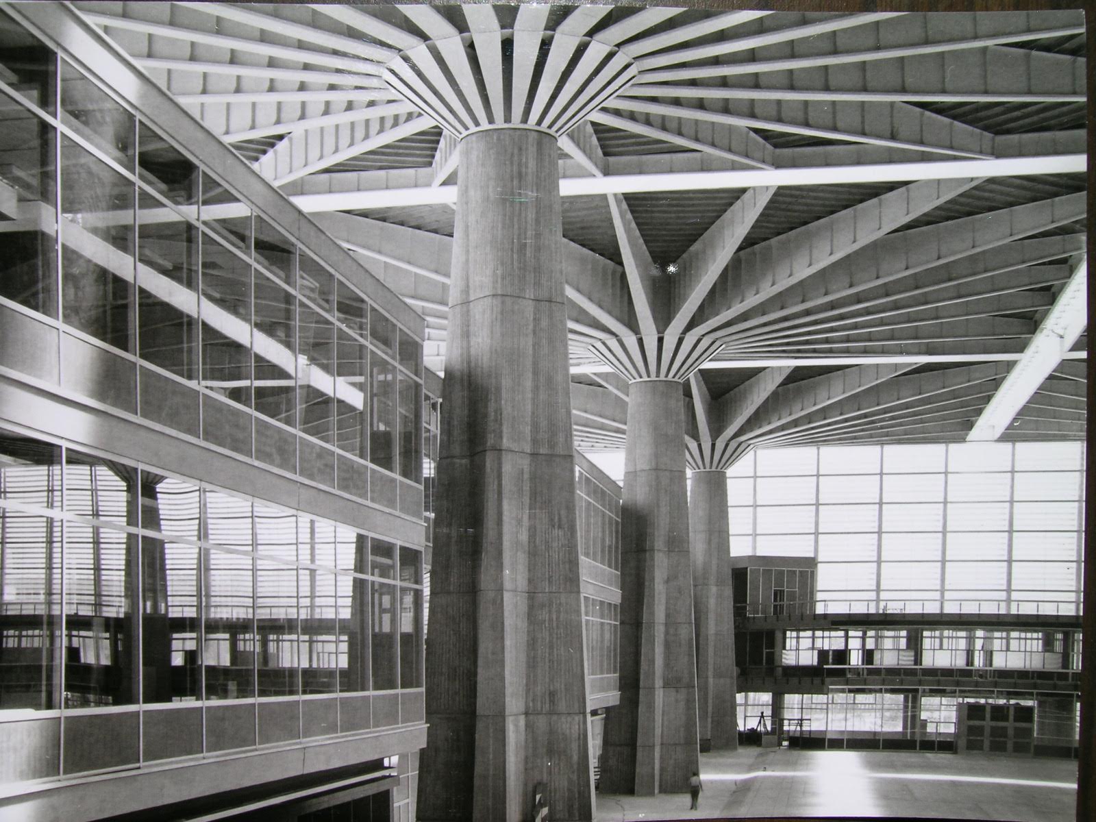 Il parallelepipedo a base quadrata di 158 m di lato e 26 m di altezza è infatti sorretto da un sistema di 16 pilastri in cemento armato a sezione variabile gettati in opera che sostengono ciascuno una raggiera di 20 travi a I in acciaio a sezione variabile anch’essi (pensati originariamente di cemento) su cui è poggiata una copertura piana metallica irrigidita perimetralmente. Gli elementi di chiusura superiore sono collegati fra loro da lucernari e contribuiscono a rendere indipendente un sistema costituito da 16 “ombrelli” ben visibili all’interno.