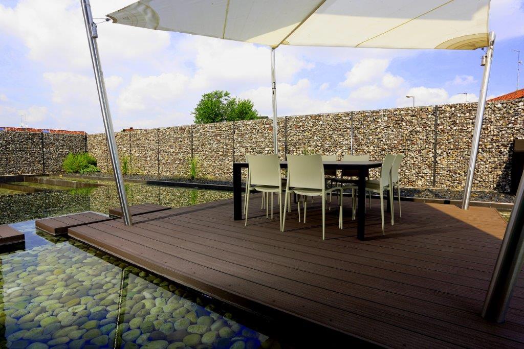 Uno spazio esterno che conquista e stupisce l’osservatore per l’originalità: è questo a caratterizzare una nuova villa realizzata in provincia di Udine. Se il verde volutamente non prevale, a rubare la scena sono i diversi specchi d’acqua presenti su un intero angolo della casa e sui quali poggia il salottino esterno realizzato su una “zattera” in doghe di legno che pare galleggi, sormontata da una vela bianca.