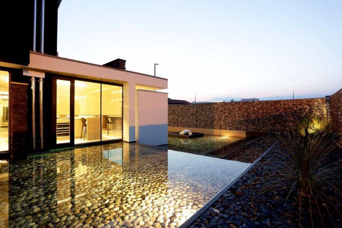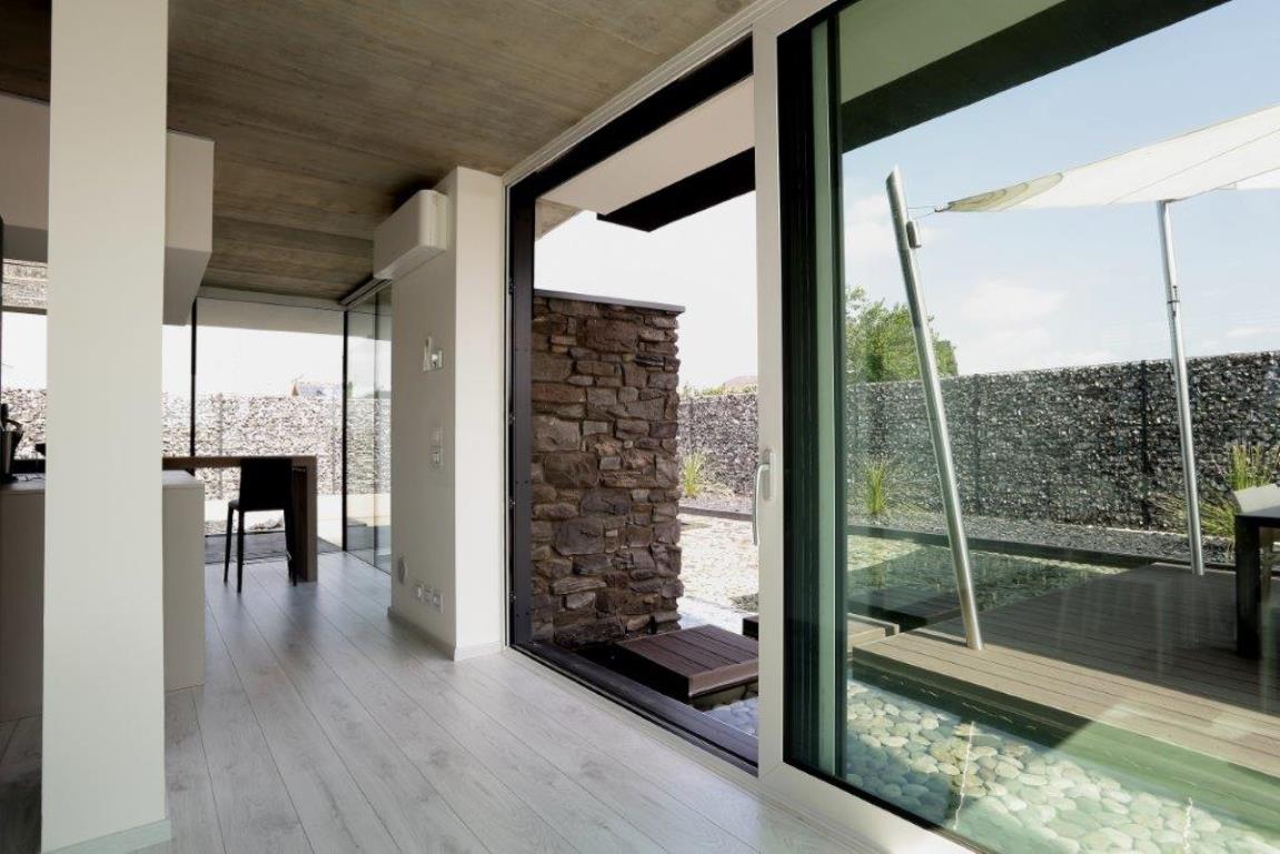 La recinzione con doppio pannello con ciottoli di fiume ha funzione decorativa e protettiva del perimetro della casa, armonizzandosi con i giochi di luce e acqua che animano una villa in provincia di Udine