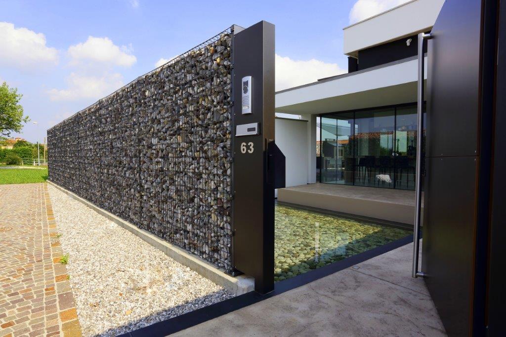 Come conferma il progettista della residenza, l’arch. Antonio Guarneri: “lungo il perimetro della casa ho scelto di far installare Zenturo Super, una recinzione di grande bellezza e potenzialità espressive, con funzionalità interessanti. Riempibile con i materiali più vari, originali, di riuso o di alto pregio, consente di ottenere pareti decorative estetiche e performanti. In questo caso ho utilizzato ciottoli di fiume di origine locale, di colori grigio-verde e iridescenti”.