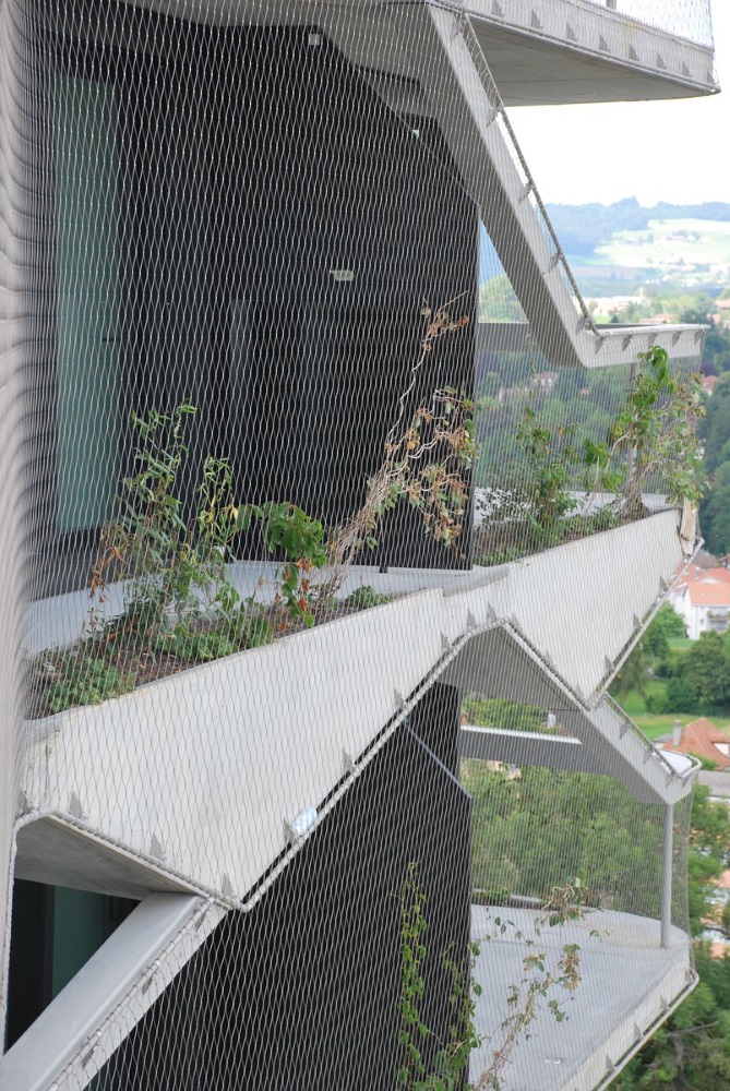 La terza, e forse la più importante per la definizione dell’edificio e del suo inserimento paesaggistico, riguarda la funzione e l’estetica insieme: le reti diventano infatti un’ampia superficie di supporto alla crescita delle piante che rendono quello che potrebbe essere solo un edificio alto di vetro e cemento una vera torre giardino. Varie tipologie di verde sono infatti seminate all’interno di 100 vasche distribuite sulle terrazze e sono irrigate in modo automatico attraverso un sistema integrato nella struttura a supporto della rete metallica. Possono ricoprire in facciata fino a 1.200 mq e sono state scelte in funzione dell’esposizione dei fronti e dell’apertura desiderata verso il paesaggio.