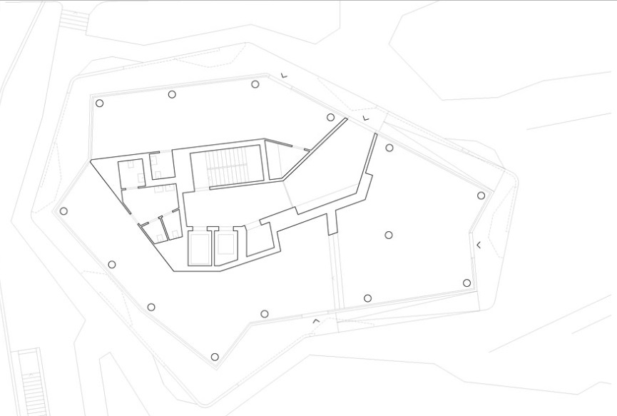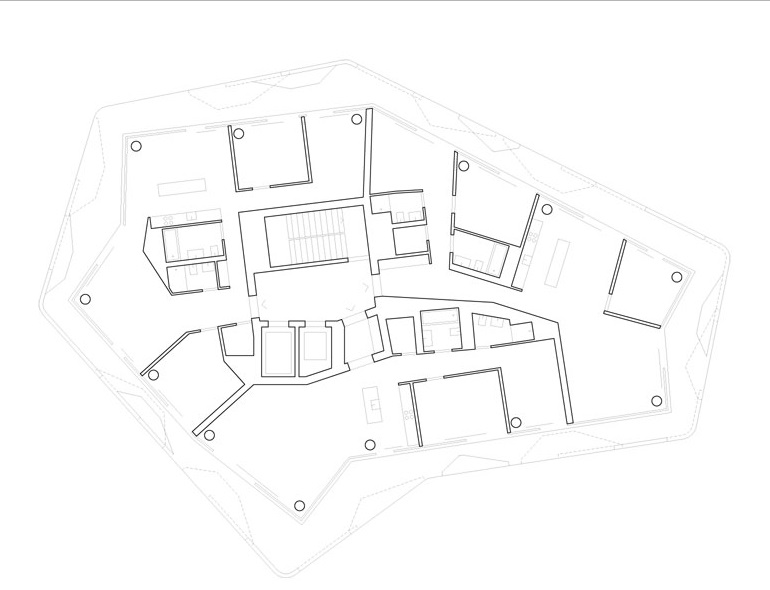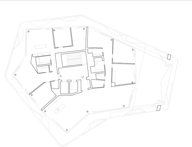 Lo sfaccettato involucro esterno è costituito da una superficie vetrata continua costituita da trasparenti chiusure a tutt’altezza per ogni piano, e dà accesso ad ampi terrazzi che circondano completamente l’edificio espandendo e animando il suo perimetro con i loro sbalzi.