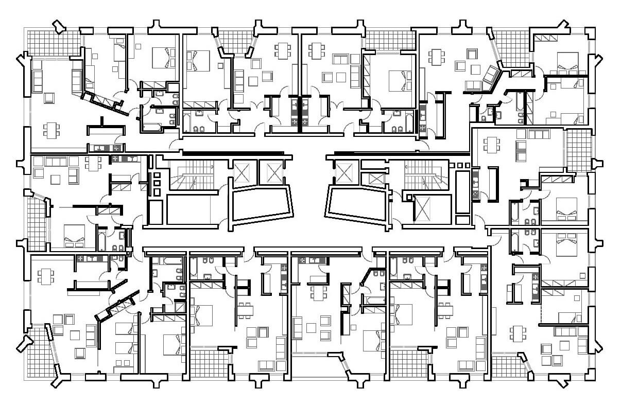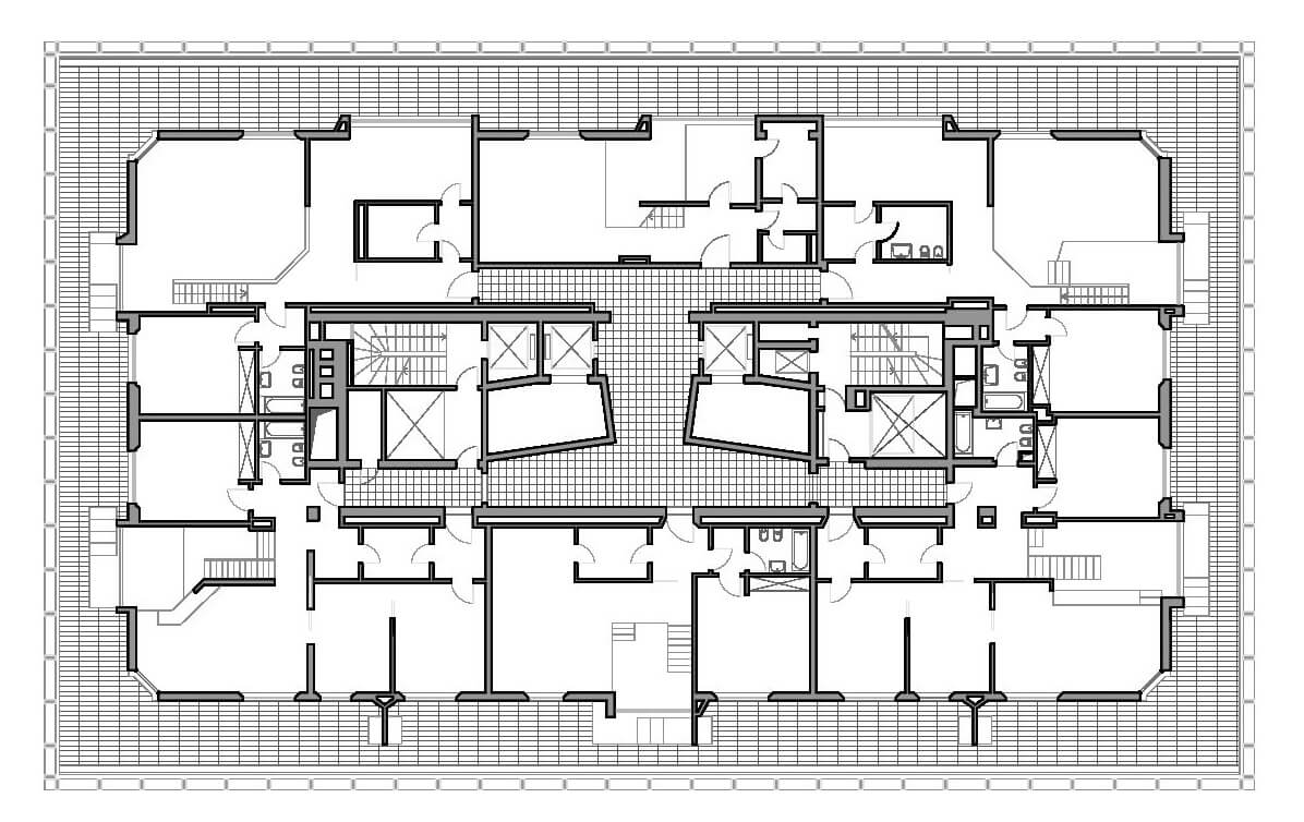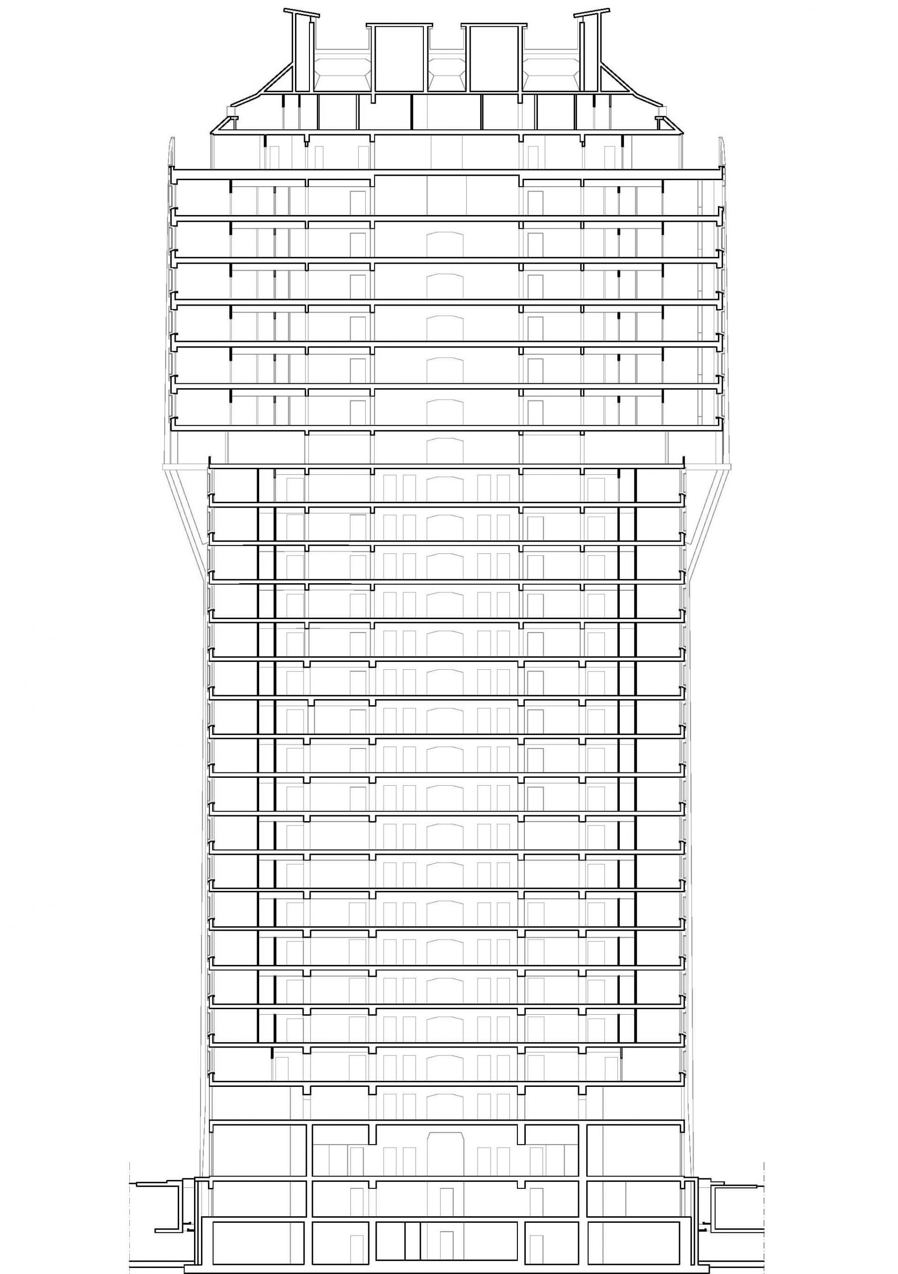 residenza. Questa è separata da un livello di passaggio che, al 18° piano, contiene locali di servizio, magazzini, aree comuni e una balconata incassata che corre attorno a tutto il perimetro. L’ultimo piano, chiuso da un tetto a falde, ospita gli appartamenti più prestigiosi, organizzati su due piani e dotati di grandi terrazze.