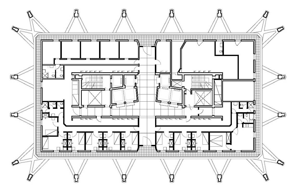 struttura portante, importante elemento identificativo dell’architettura. Il sistema si compone di due elementi: il sostegno centrale dato dal blocco di collegamenti verticali e i pilastri lungo il perimetro. I