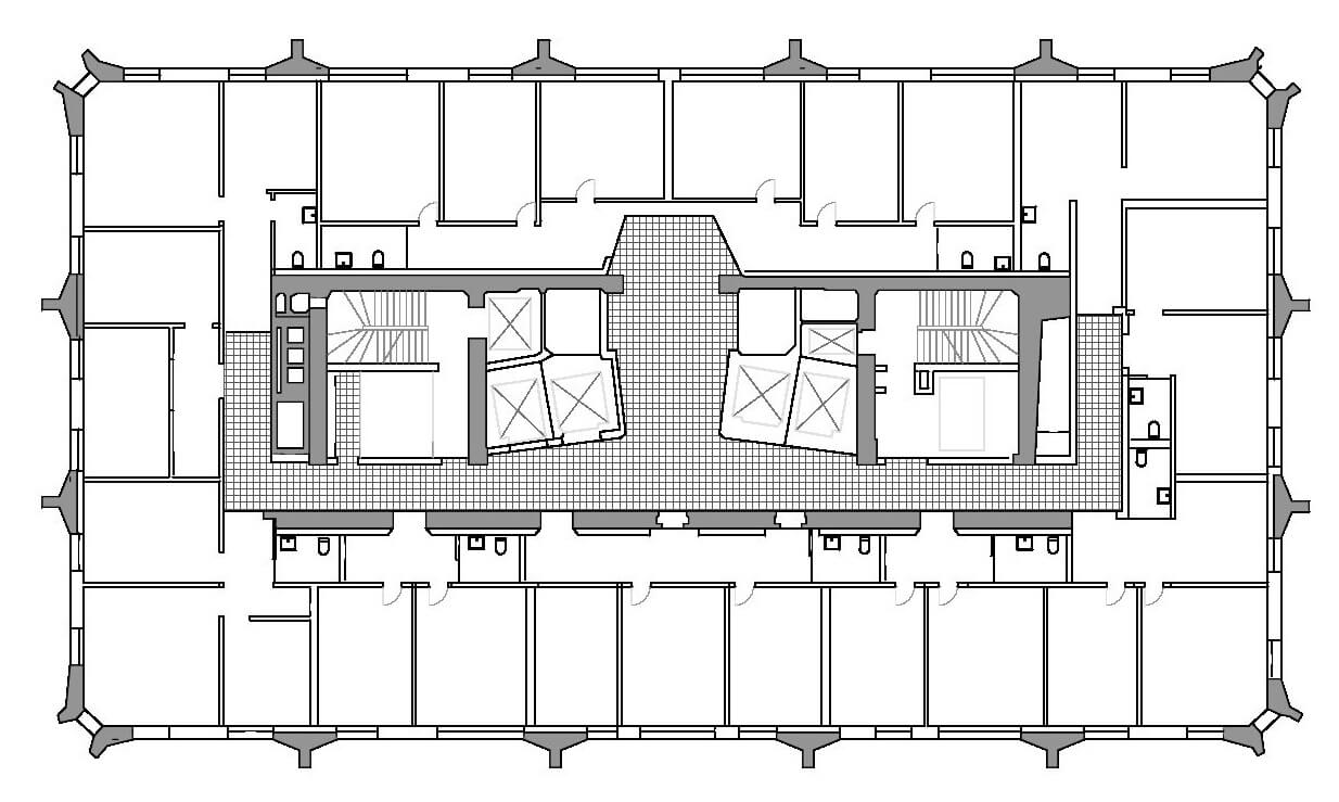 uffici occupano l’interno del fusto, mentre gli ultimi sette piani accolgono la