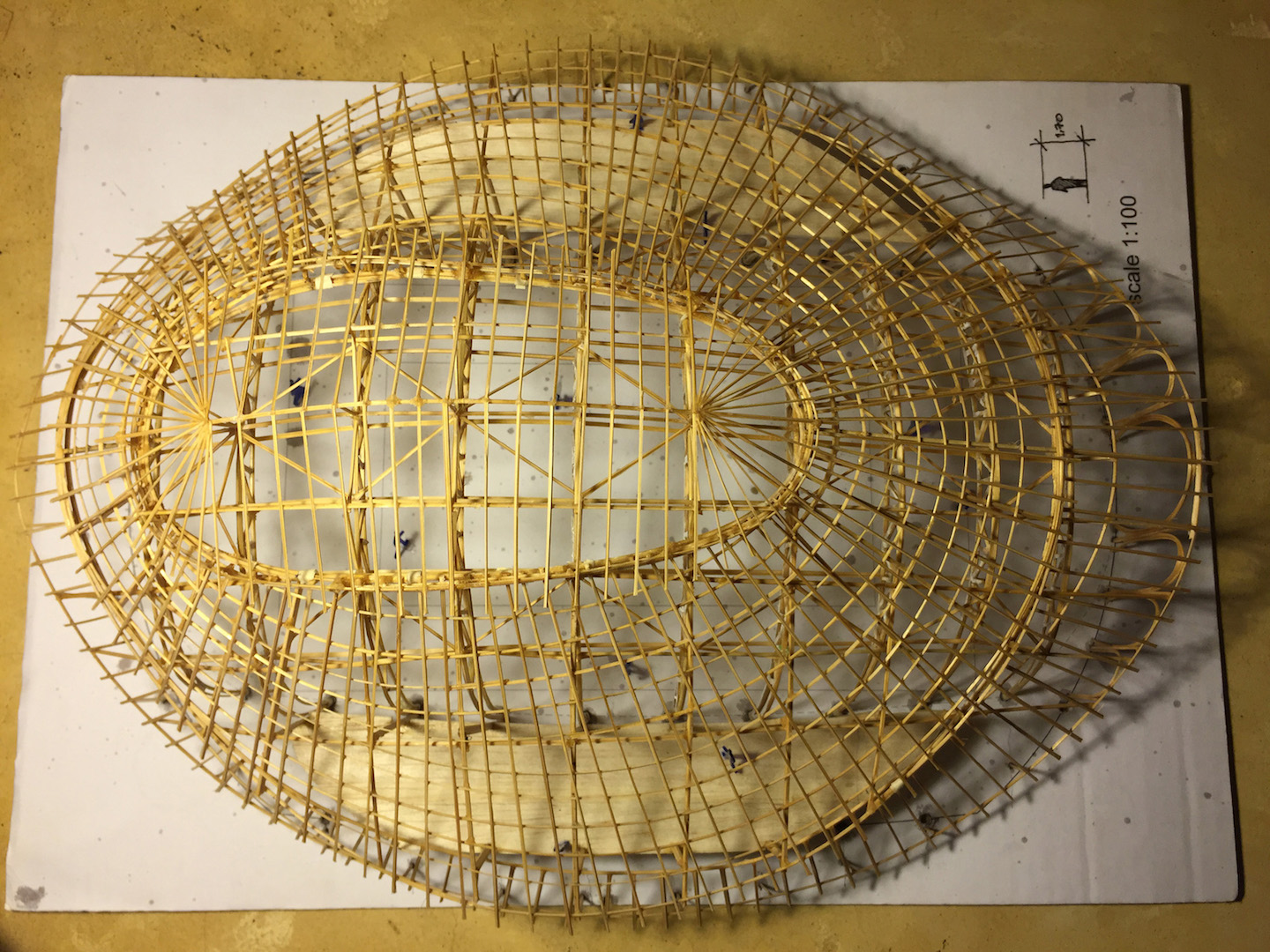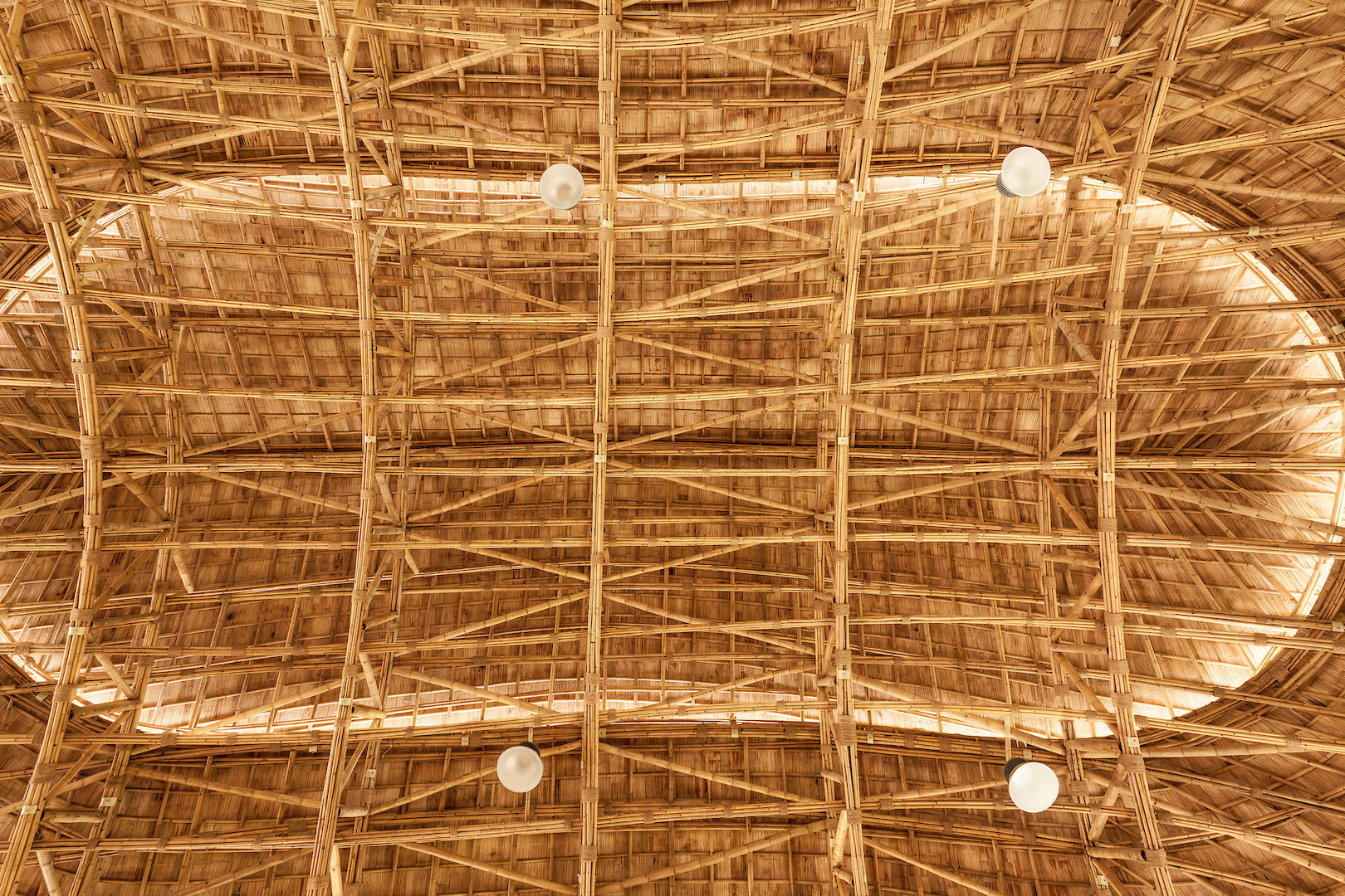 La struttura in bambù lasciata a vista, presenta tralicci prefabbricati uniti insieme attraverso funi e corde, senza connessioni o rinforzi in acciaio © Alberto Cosi