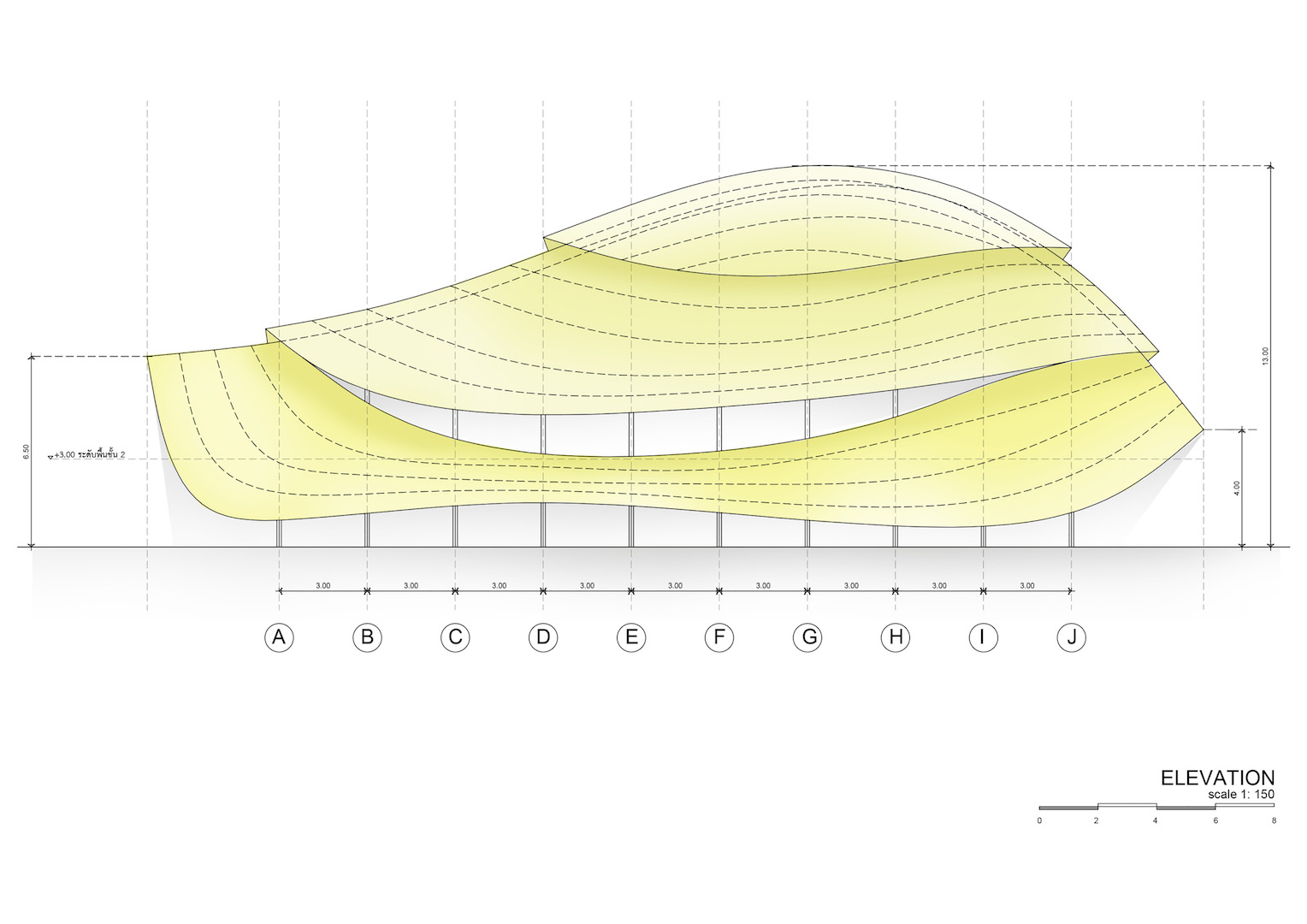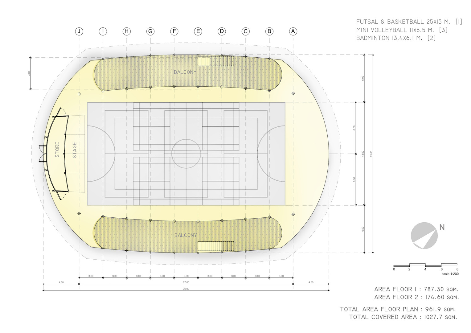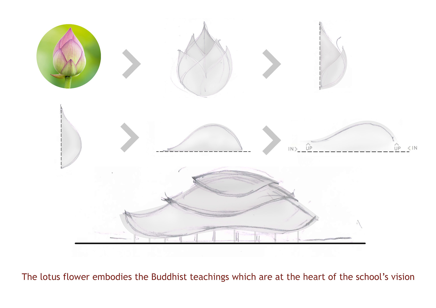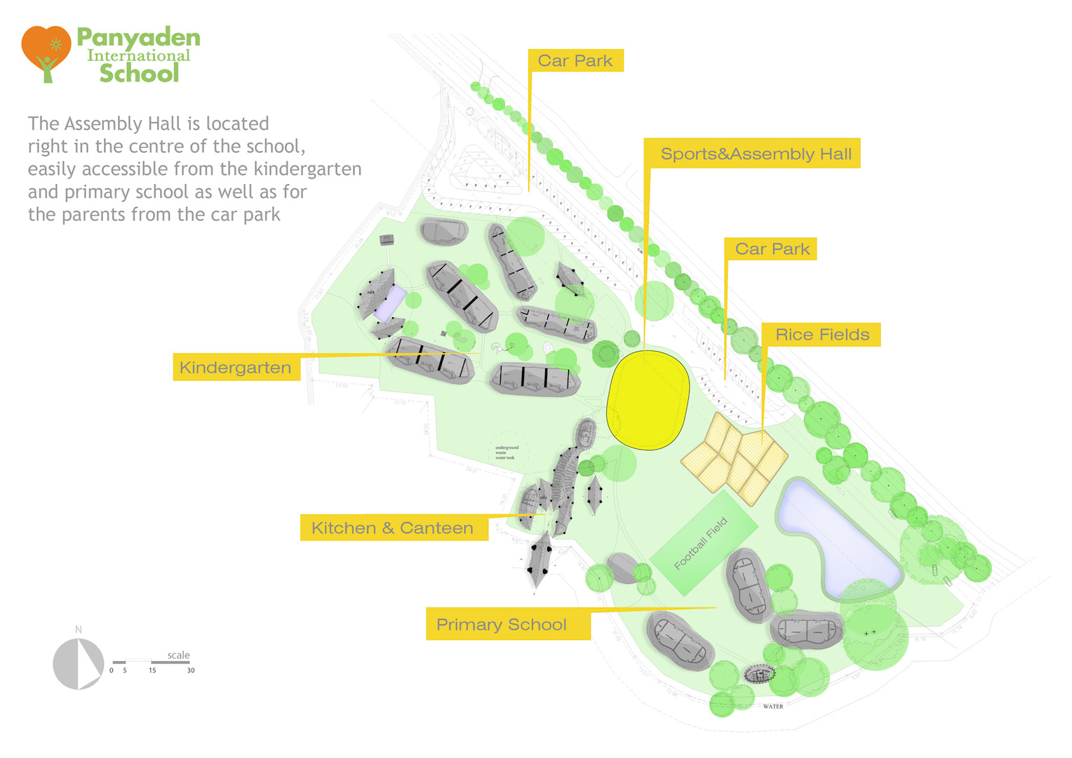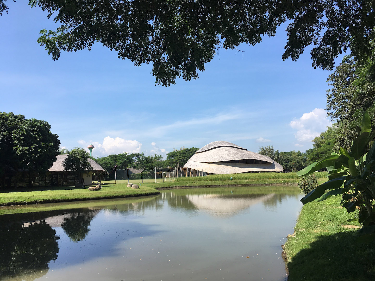In linea con l’etica green della scuola, il nuovo padiglione è interamente in bambù e riduce l’impronta di carbonio a zero. All’interno, una sala progettata per ospitare un massimo di 300 persone, si estende su un’area di circa 787 mq e presenta un campo per il gioco del basket, del futsal (calcio a 5), della pallavolo o del volano, coperto da un intricato traliccio strutturale in bambù lasciato a vista. Contrapposto all’ingresso vi è inoltre un palco per piccole rappresentazioni o incontri, dietro al quale si cela un ripostiglio per le attrezzature sportive. Balconate in bambù ricavate all’interno della costruzione, corrono longitudinalmente ai lati del campo e offrono a visitatori e genitori la possibilità di assistere agli eventi. Esternamente il padiglione mostra invece una copertura ondulata la cui forma, modellata su tre livelli che si sovrappongono, ricorda i petali del fiore di loto, simbolo di purezza e di rigenerazione spirituale secondo il buddismo; ulteriore rimando ai principi educativi della scuola.