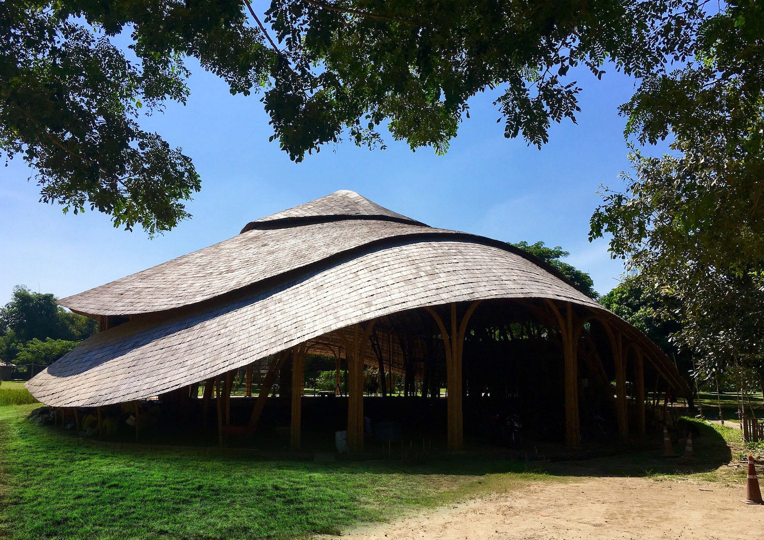 Il bambù come materiale da costruzione, utilizzato principalmente nel sud-est asiatico, è molto amato non solo per la notevole resistenza strutturale ma anche per l’impronta ecologica perfettamente il linea con l’istruzione olistica e i principi buddisti di una buona fetta dei paesi orientali. È il caso della scuola internazionale di Panyaden, situata nella città di Chiang Mai nel nord della Thailandia, costruita solo con materiali naturali come terra e bambù per avvicinare i bambini alla natura secondo l’educazione buddista e mostrare loro le potenzialità di un’architettura dal design organico, sostenibile e contemporaneo senza l’utilizzo di calcestruzzo o acciaio. Una delle ultime realizzazioni per questo complesso scolastico (che include scuola materna ed elementare) consiste in un’arena al coperto per lo sport, spettacoli e assemblee (Sports & Assembly Hall), messa a punto da Chiangmai Life Architects (CLA) insieme a Chiangmai Life Construction (CLC), specializzati in grandi strutture in bambù, terra e legno.