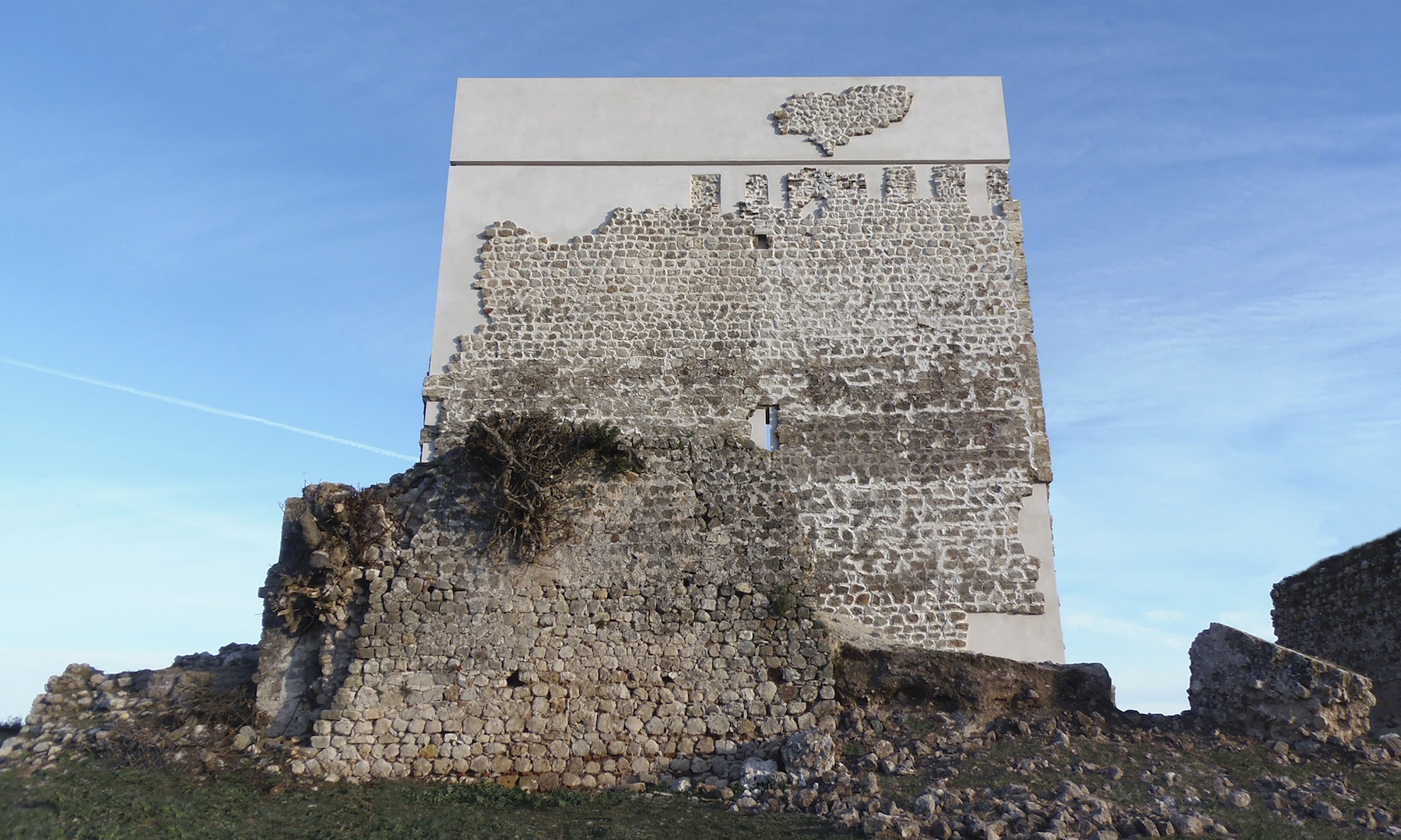 La struttura della torre, soprattutto nel sua parte superiore frastagliata, correva il grave rischio di collasso o ribaltamento, pertanto una nuova porzione in mattoni forati è stata realizzata non solo con l’obiettivo di completare la costruzione per rimarcare il volume originario della torre, ma anche per ragioni di consolidamento. Distinguibile e leggibile nell’insieme architettonico, la nuova aggiunta è ricoperta da una malta di calce bianca (applicata su una malta bastarda rinforzata con fibra di vetro) che ripropone la pigmentazione originale di un tempo. Inoltre quando la nuova aggiunta incontra il corpo esistente è stato individuato un gap di 15 cm affinché la nuova porzione risulti arretrata rispetto al paramento originale. Un telaio metallico (con profili in acciaio HEB 140) insieme a travetti in cemento armato rende ancora più stabile la struttura, mentre tondini in acciaio del diametro di 20 mm sono stati impiegati per consolidare le volte. Anche la stessa pietra calcarea caduta dalla vecchia torre è stata riutilizzata per ricostruire i nuclei centrali deteriorati; infine tutte le superfici originali, compreso l’affresco esistente, sono state pulite con un trattamento bioacido che permetterà la conservazione.