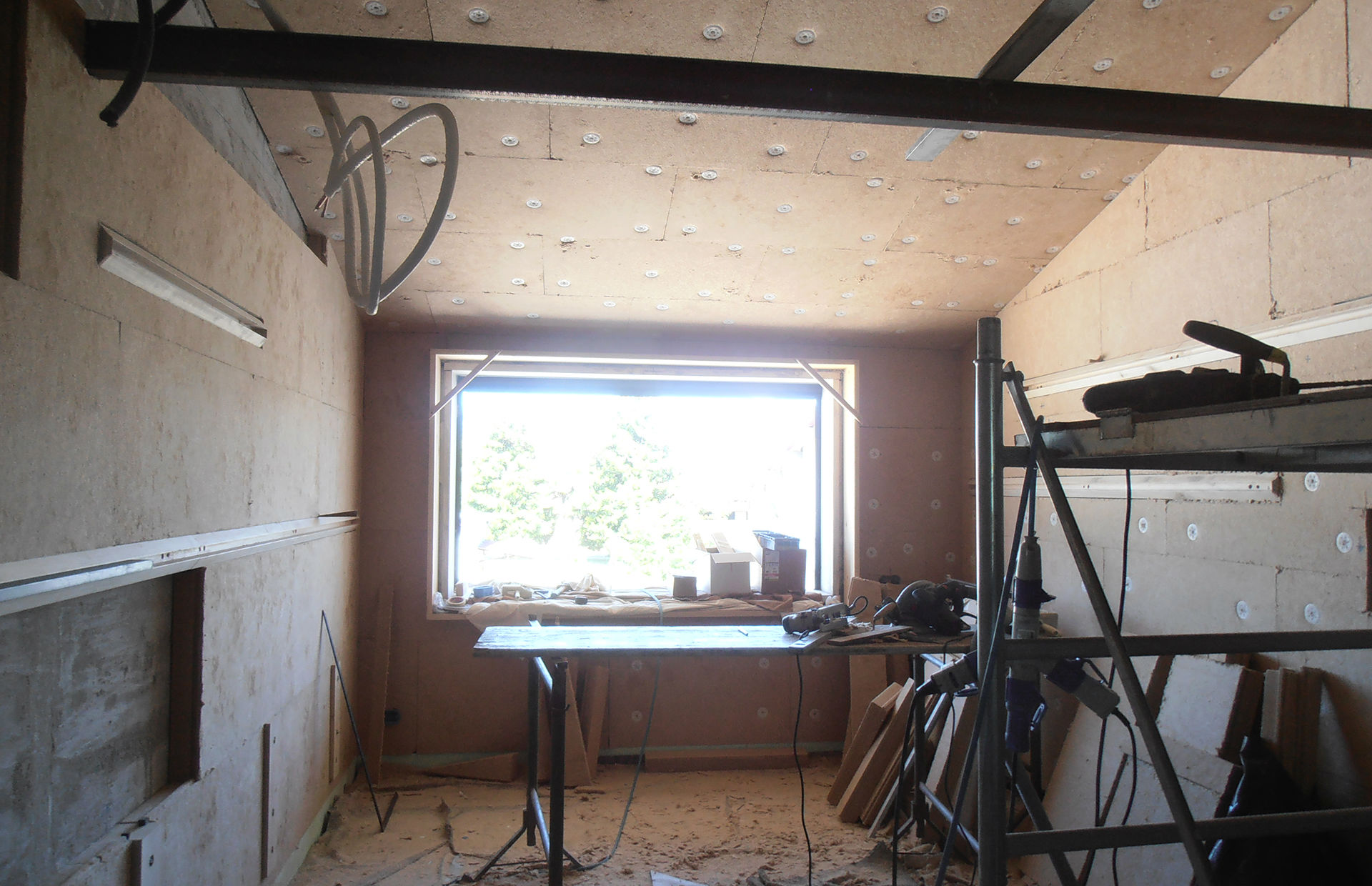 Fase di cantiere: posa dell’isolamento in fibra di legno su copertura e pareti © Martinuzzi – Quinto
