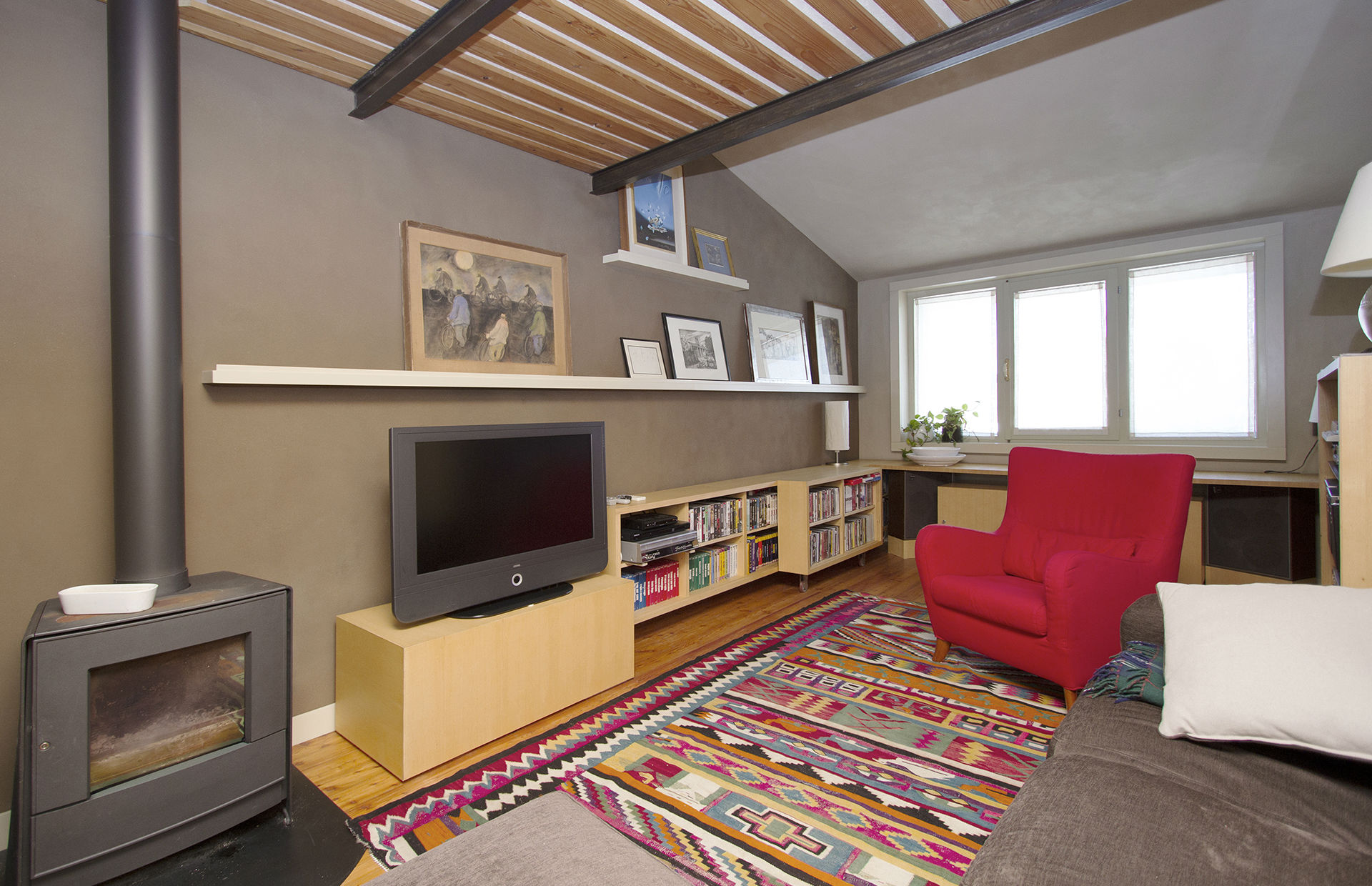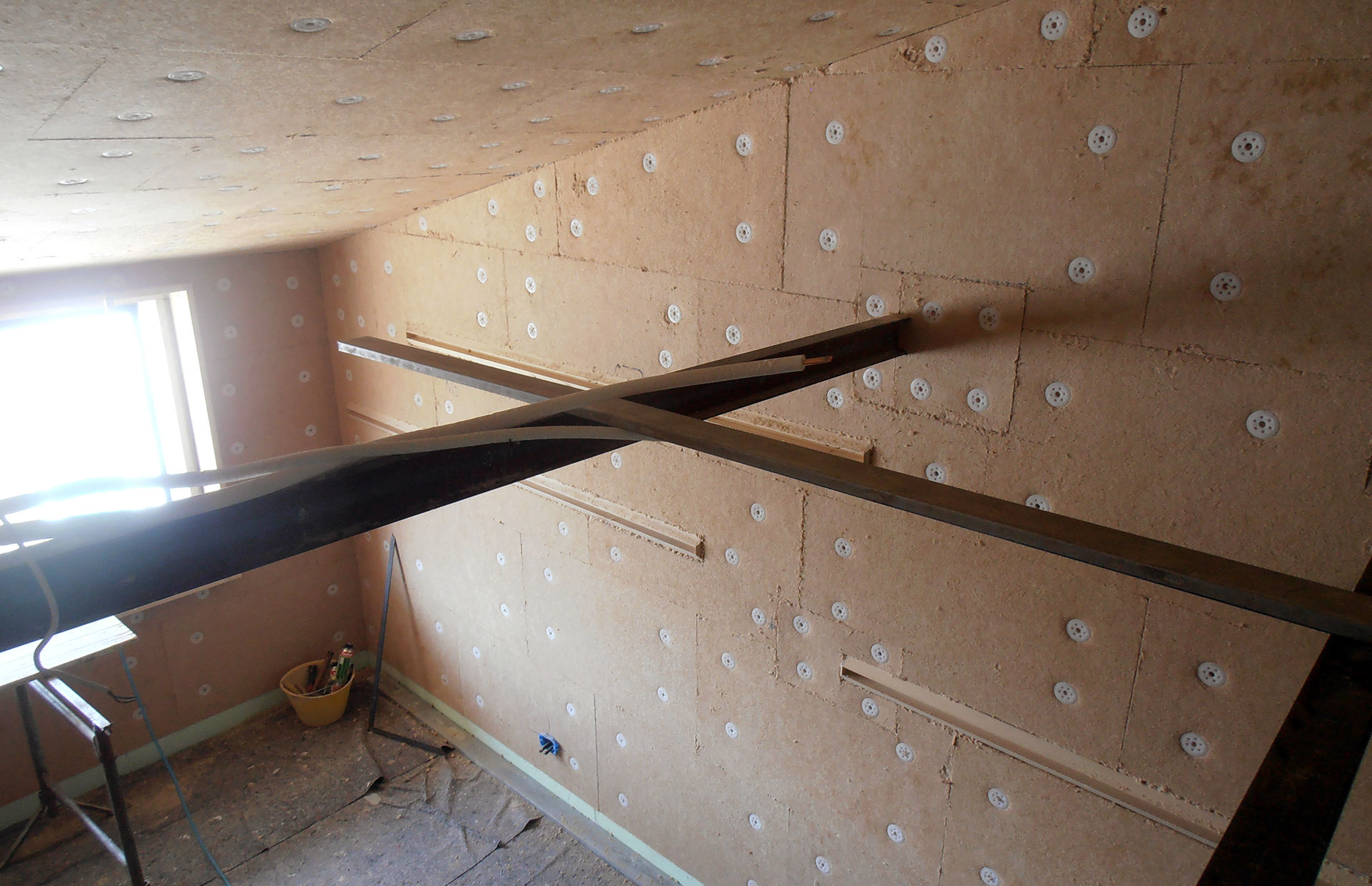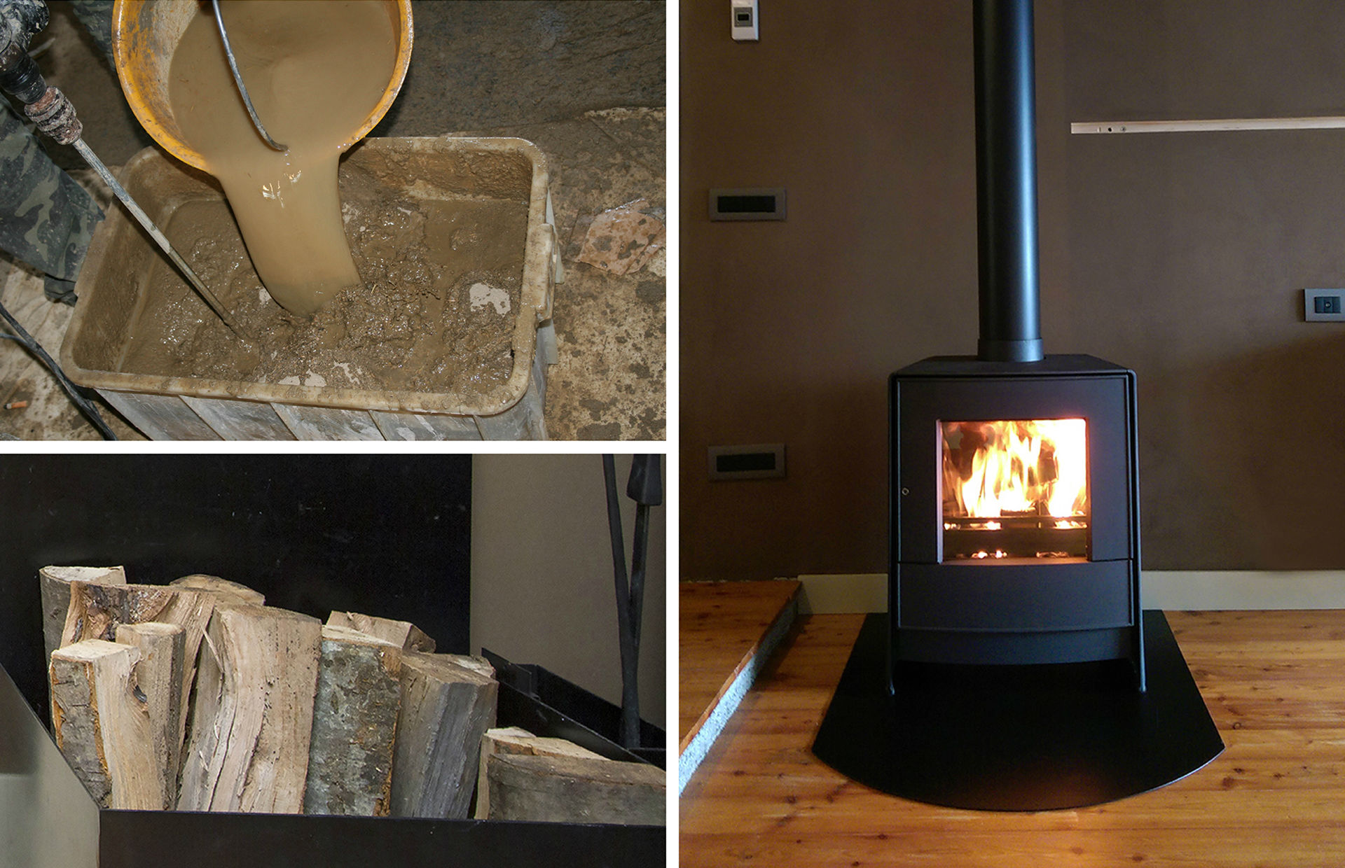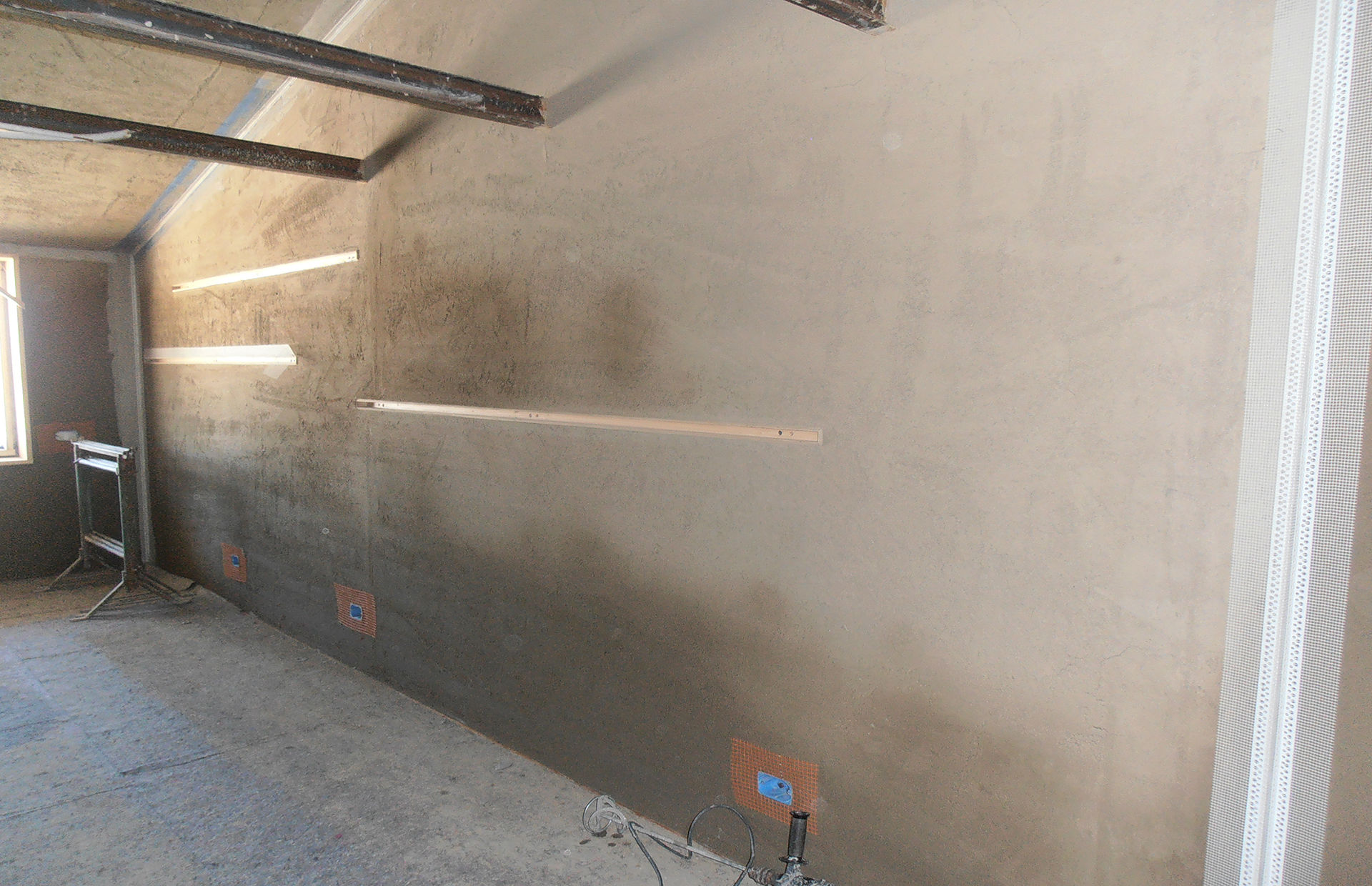 L’obbiettivo principale dell’intervento era riqualificare energeticamente e rendere salubre l’ambiente. Dopo una attenta diagnosi e una valutazione dei sistemi disponibili sul mercato, si è scelto un isolamento dall’interno in fibra di legno, dello spessore di 8 cm con uno strato funzionale ai silicati. Posato su un intonaco di base in calce, che doveva livellare le innumerevoli imperfezioni dei muri, è stato poi rifinito con un intonaco in argilla, a più strati, con funzione igro-regolatrice ed estetica. La stanza è stata completamente rivestita su soffitto e pareti da questo pacchetto, coadiuvato nel suo funzionamento dalla scelta impiantistica: una stufa a legna per il riscaldamento invernale e una pompa di calore per il raffrescamento e la deumidificazione estiva. Il risultato raggiunto, in termini di efficienza energetica, è stato molto soddisfacente perché ha comportato un miglioramento medio del 68%.