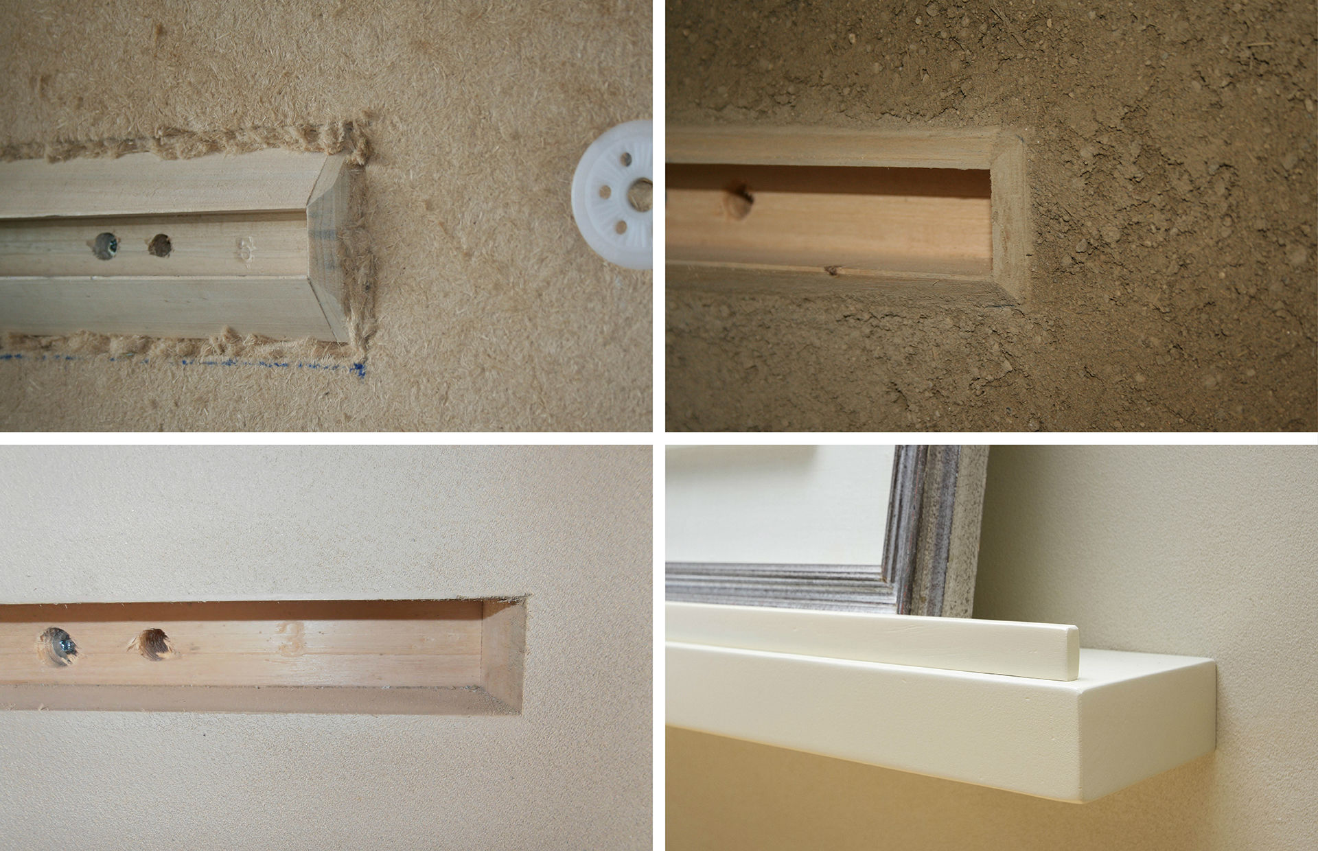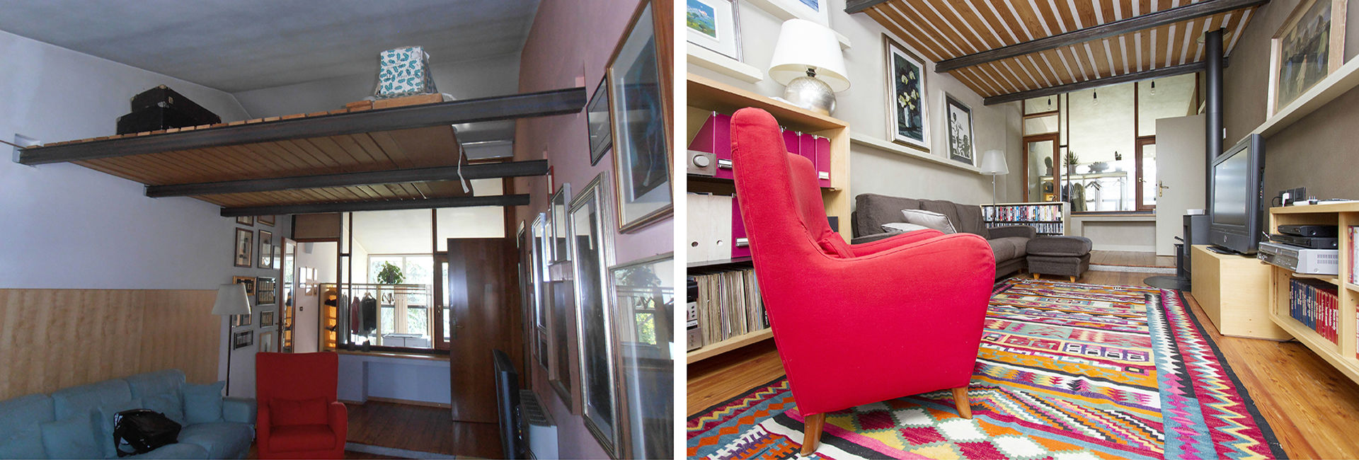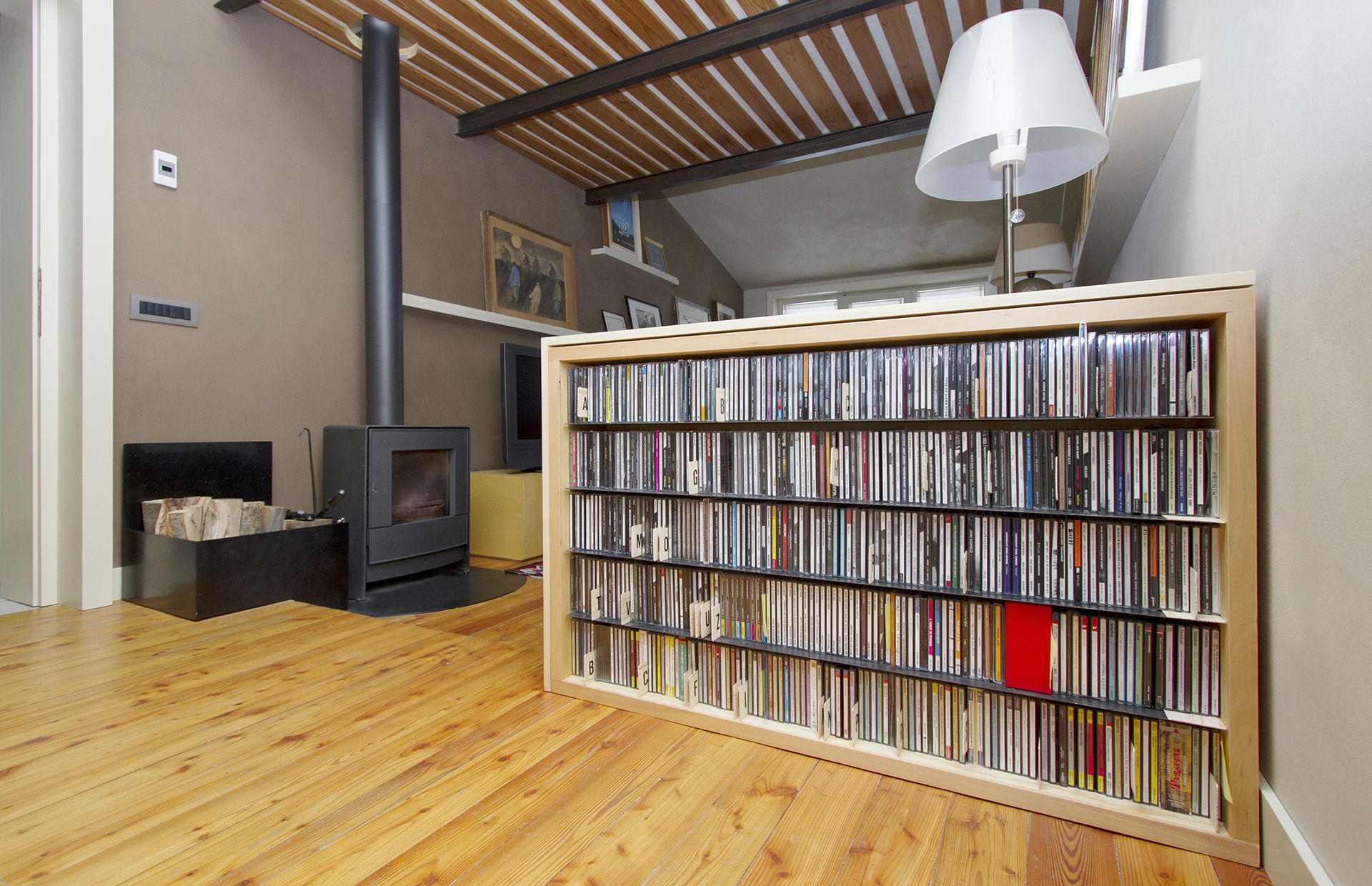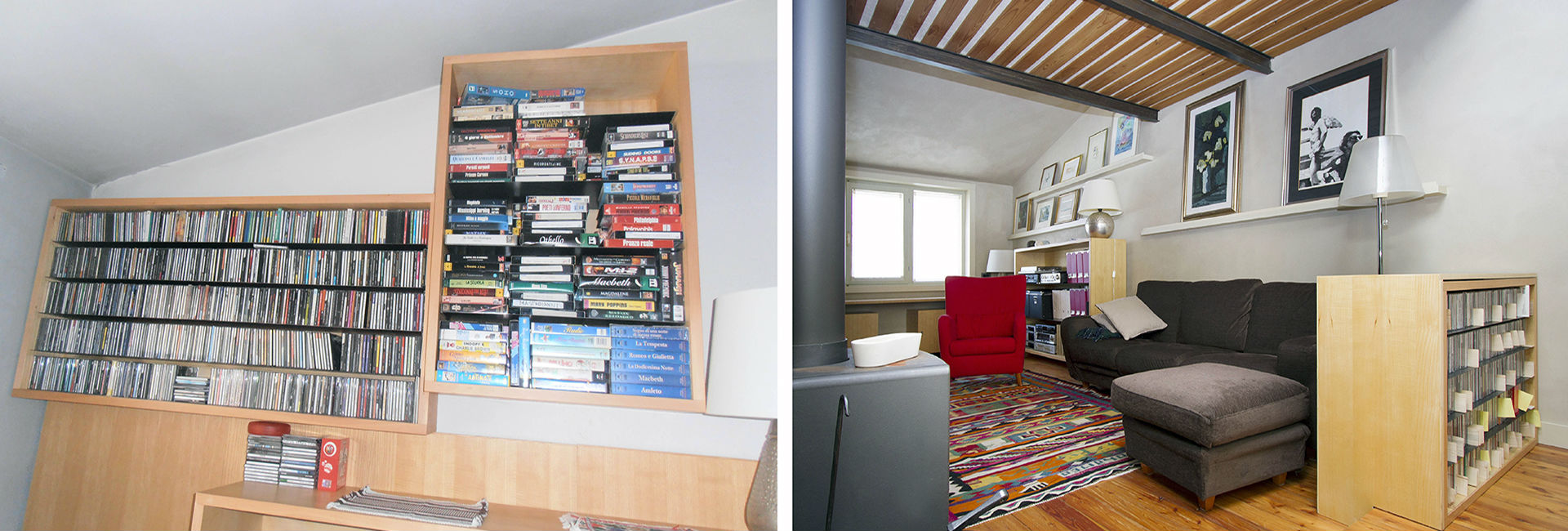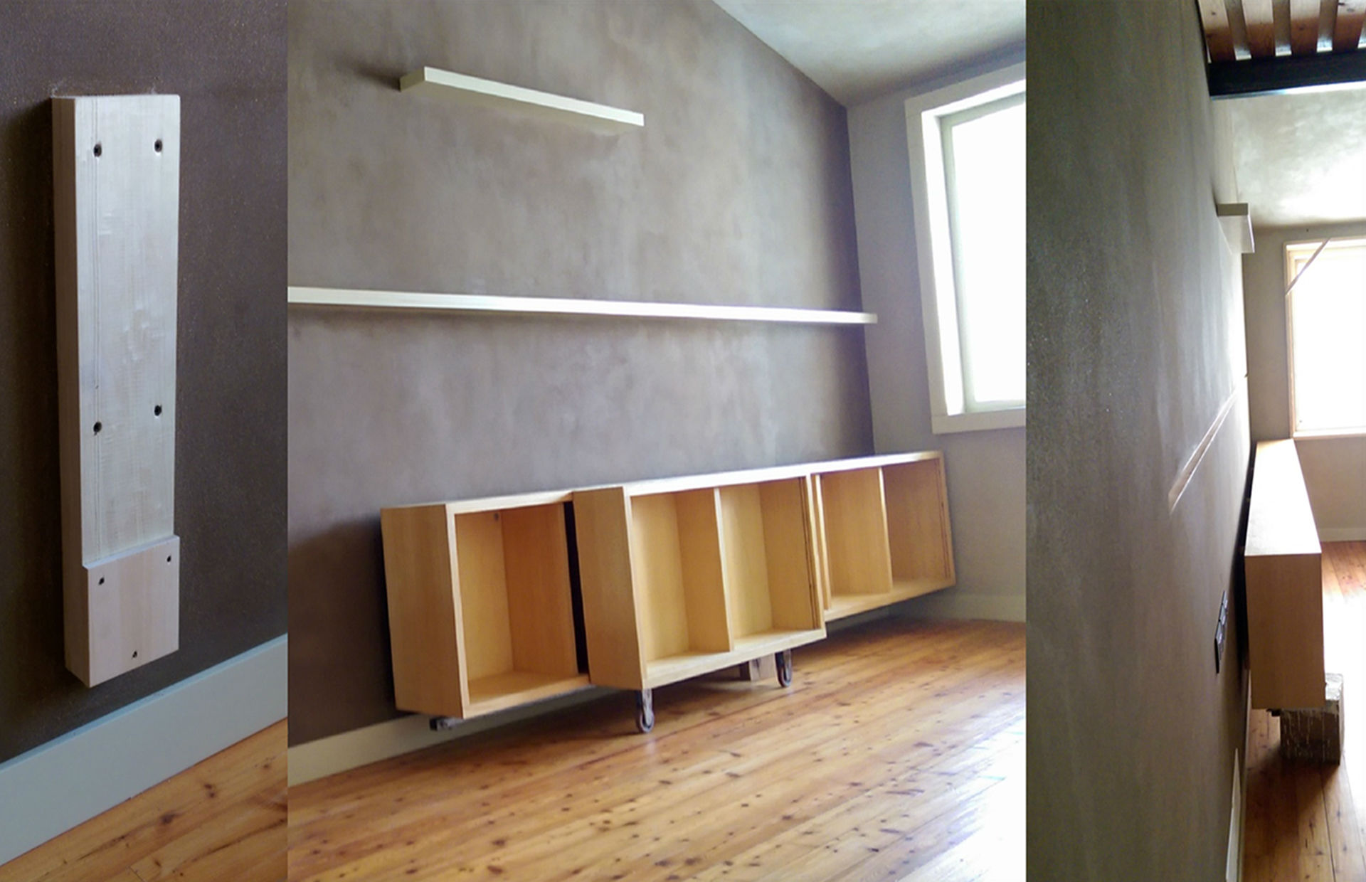 Ogni singolo elemento del nuovo/vecchio arredo è stato progettato attentamente fin dalle fasi iniziali, perché ogni aspetto doveva essere delineato prima della posa del cappotto stesso, in modo da permettere all’insieme di funzionare come un unico organismo. Pertanto, le mensole porta-quadri e ogni singolo mobile è stato disegnato e pensato in quest’ottica, compreso il sostegno del mobile libreria, unico arredo rimasto agganciato alla parete, in quanto una modifica ne avrebbe compromesso in modo sostanziale l’idea originaria. Infatti, quest’ultimo era dotato di un elemento scorrevole che funzionava solo se il mobile risultava appeso. Gli altri elementi sono stati tutti poggiati con “i piedi per terra”, tramite ruote o sostegni o diventando essi stessi il filtro divisorio tra gli spazi.