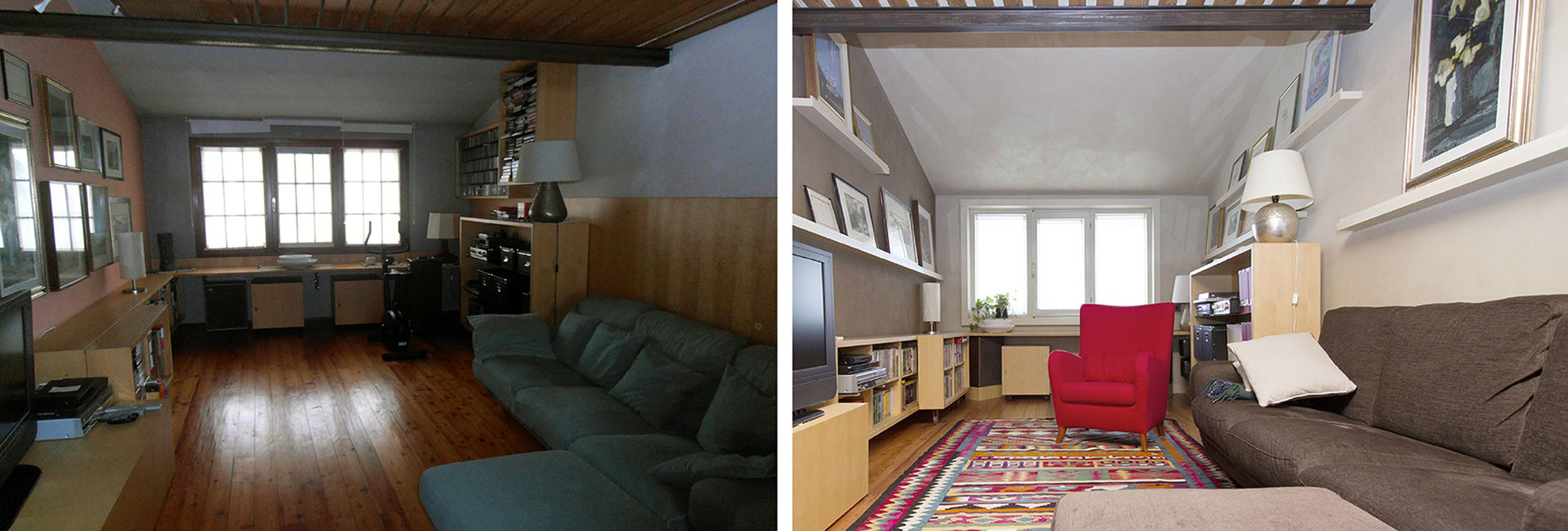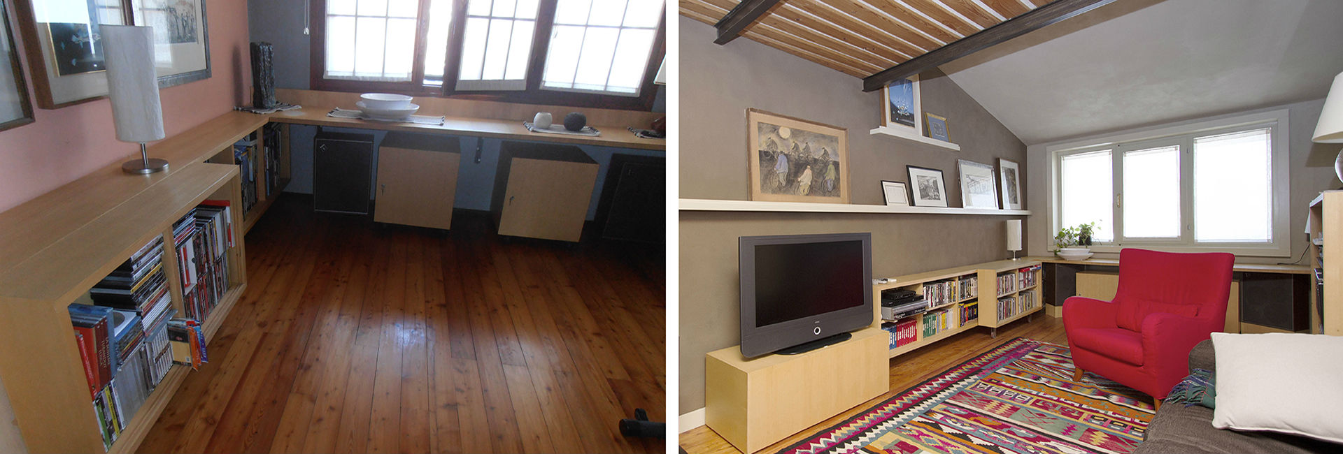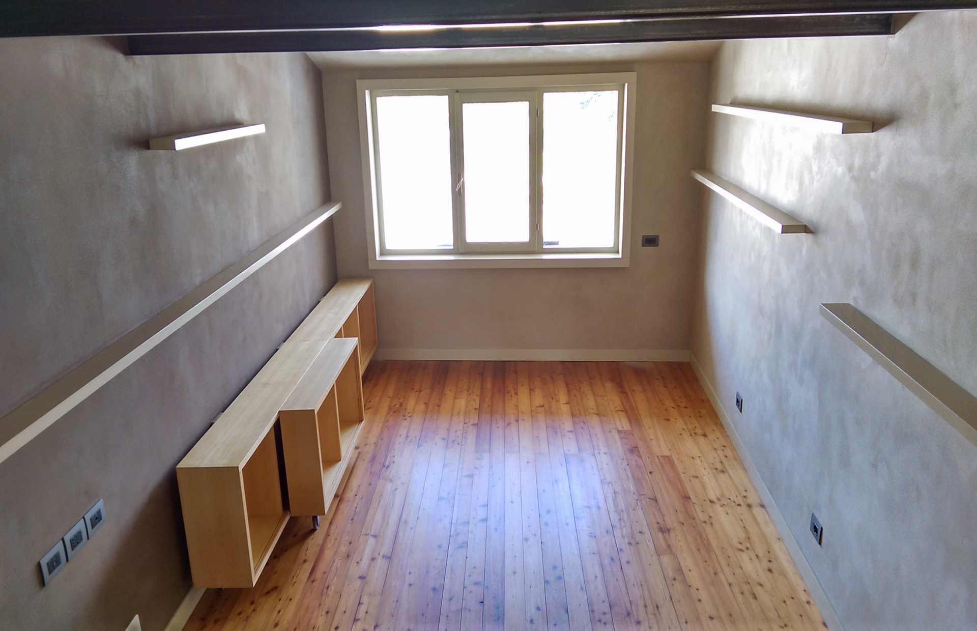 Lo spazio esistente si presentava carico di molti elementi, sia in termini di oggetti che di colori, aveva anche delle caratteristiche peculiari di cui bisognava tenere conto: si sviluppava su un asse longitudinale, risultando stretto e lungo e riceveva luce diretta solo da una finestra posizionata a nord-ovest. Il fine progettuale era, dunque, di trovare un leit motiv che unisse in modo omogeneo elementi con frasi stilistiche diverse, creando uno spazio neutro, ma, allo stesso tempo caldo e luminoso. Un contenitore capace di accogliere armoniosamente e far risaltare i singoli oggetti, che però doveva essere riempito solo fino ad un certo punto: il punto di equilibrio tra passato e presente.