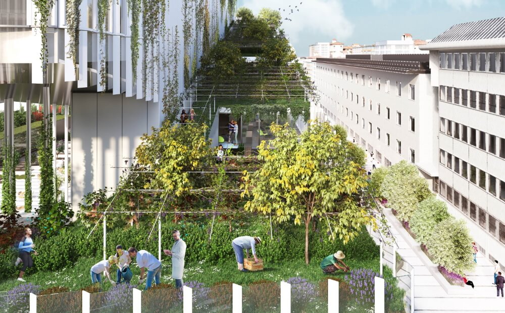 promenade verde accompagna lungo l’involucro dell’edificio toccando terrazzi e serre con orti urbani e coltivazioni idroponiche. Il punto di arrivo, collocato sulla copertura, è un altro spazio verde coltivato a vite ed erbe aromatiche.